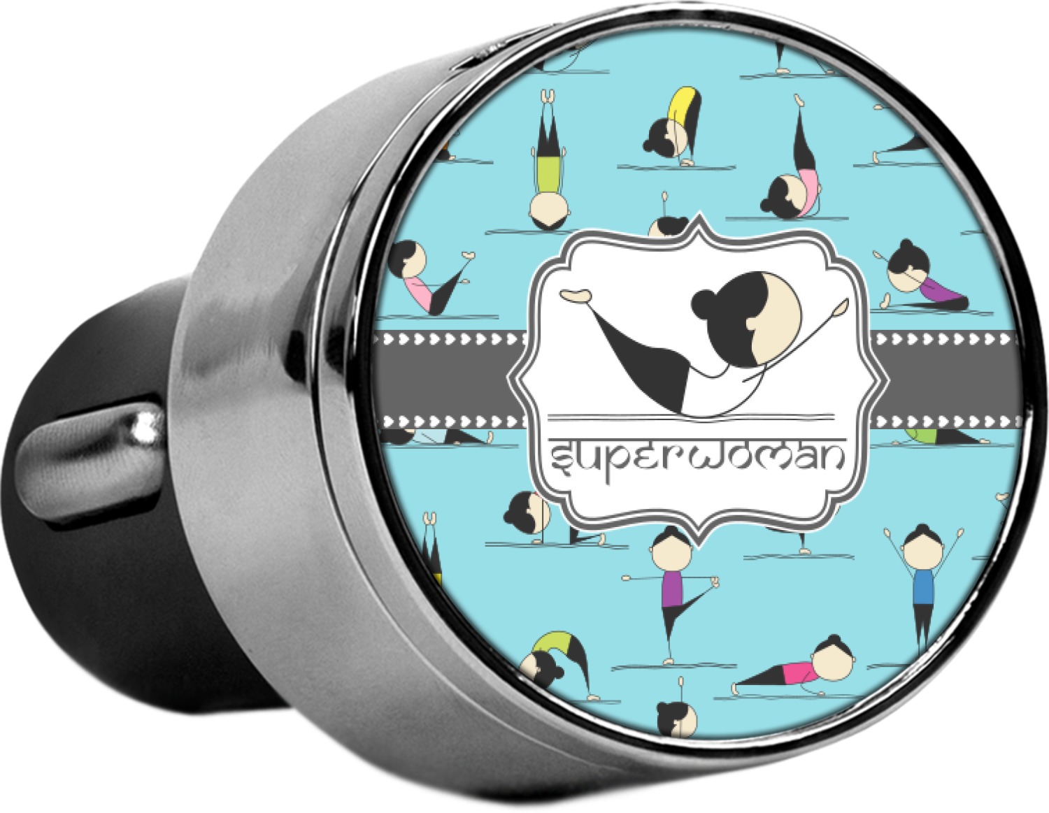 This car charger adapter converts your cars bland cigarette lighter into a decorative, personalized, and operational USB charging port. Made of solid, silver-plated metal, these chargers feature a flip-open lid that both displays your customized design and conceals two USB ports. The metal lid of the USB car charger adapter is 1.5" in diameter and seals due to a small, ingrained magnet on both the charger and its lid. The cigarette lighter insert, itself, is colored black.