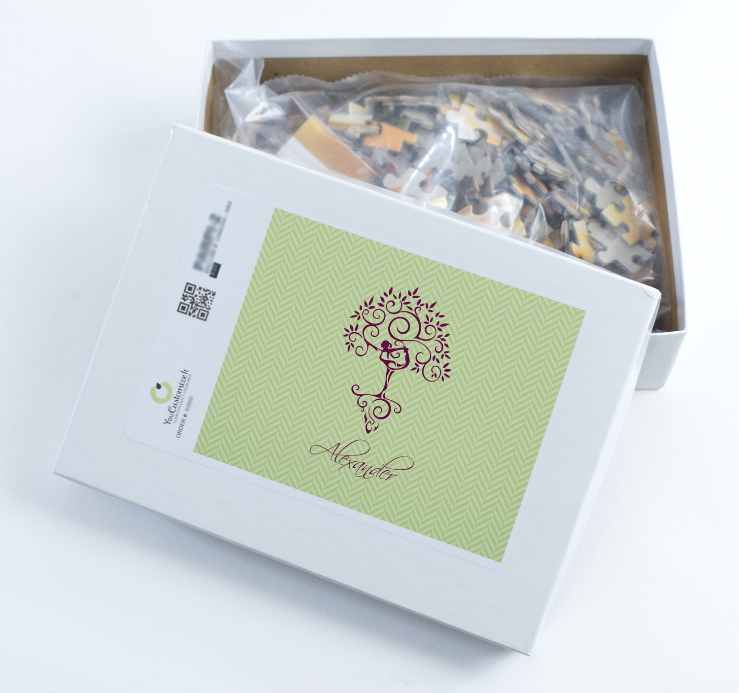 We print our puzzles on thick white chipboard in vibrant colors, then laminate the chipboard and die cut your puzzle. Your jigsaw puzzle is shipped to you in a box with the image of the puzzle on the box.