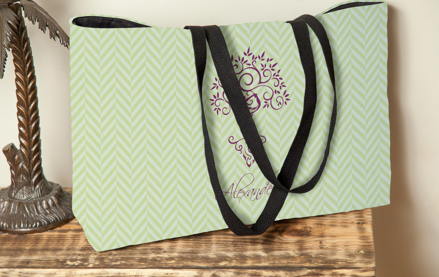 These beach totes are handmade here in the USA. Fabric is printed with your design. The tote is then sewn from the fabric pieces, lining and handles added.