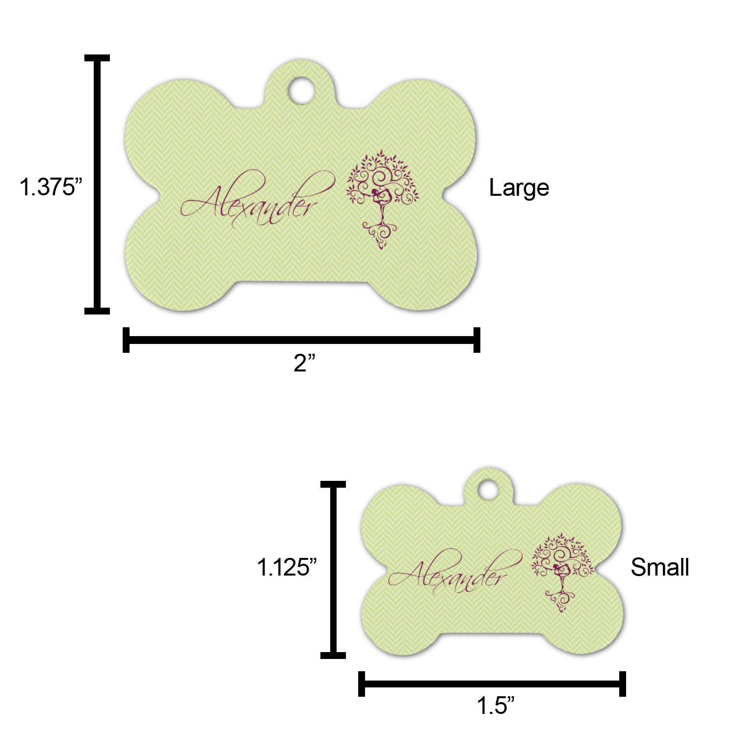 The small bone dog tag size is perfect to pair with our small dog collars, the large size pairs well with our large dog collars.