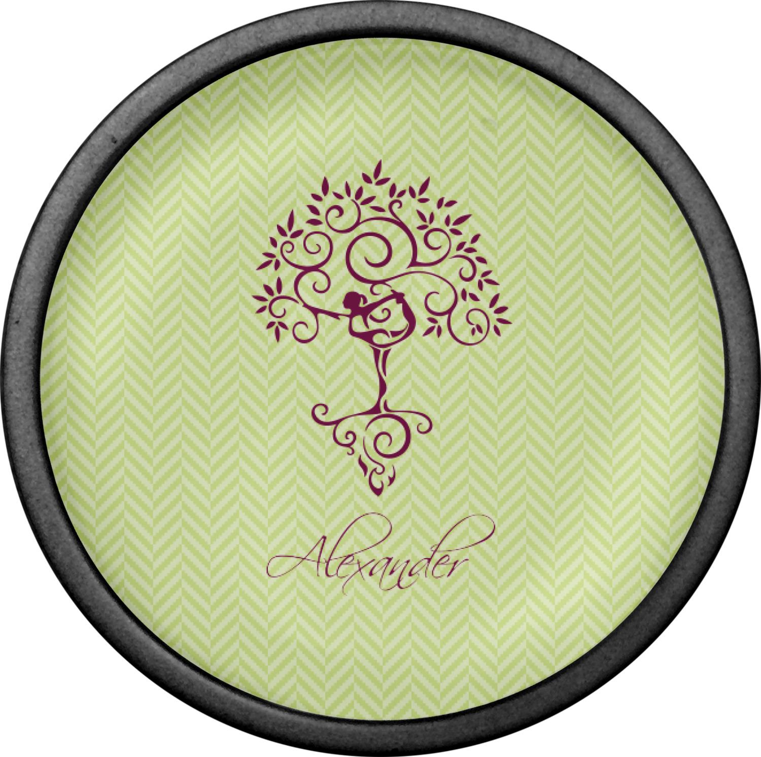 This design, set over a light lime-green chevron, is the epitome of elegance. A woman in a graceful yoga pose stands as still as a tree- in fact, she blends right into it.