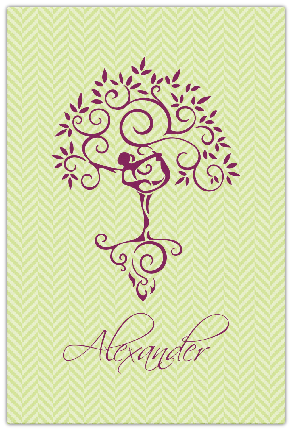This design, set over a light lime-green chevron, is the epitome of elegance. A woman in a graceful yoga pose stands as still as a tree- in fact, she blends right into it.