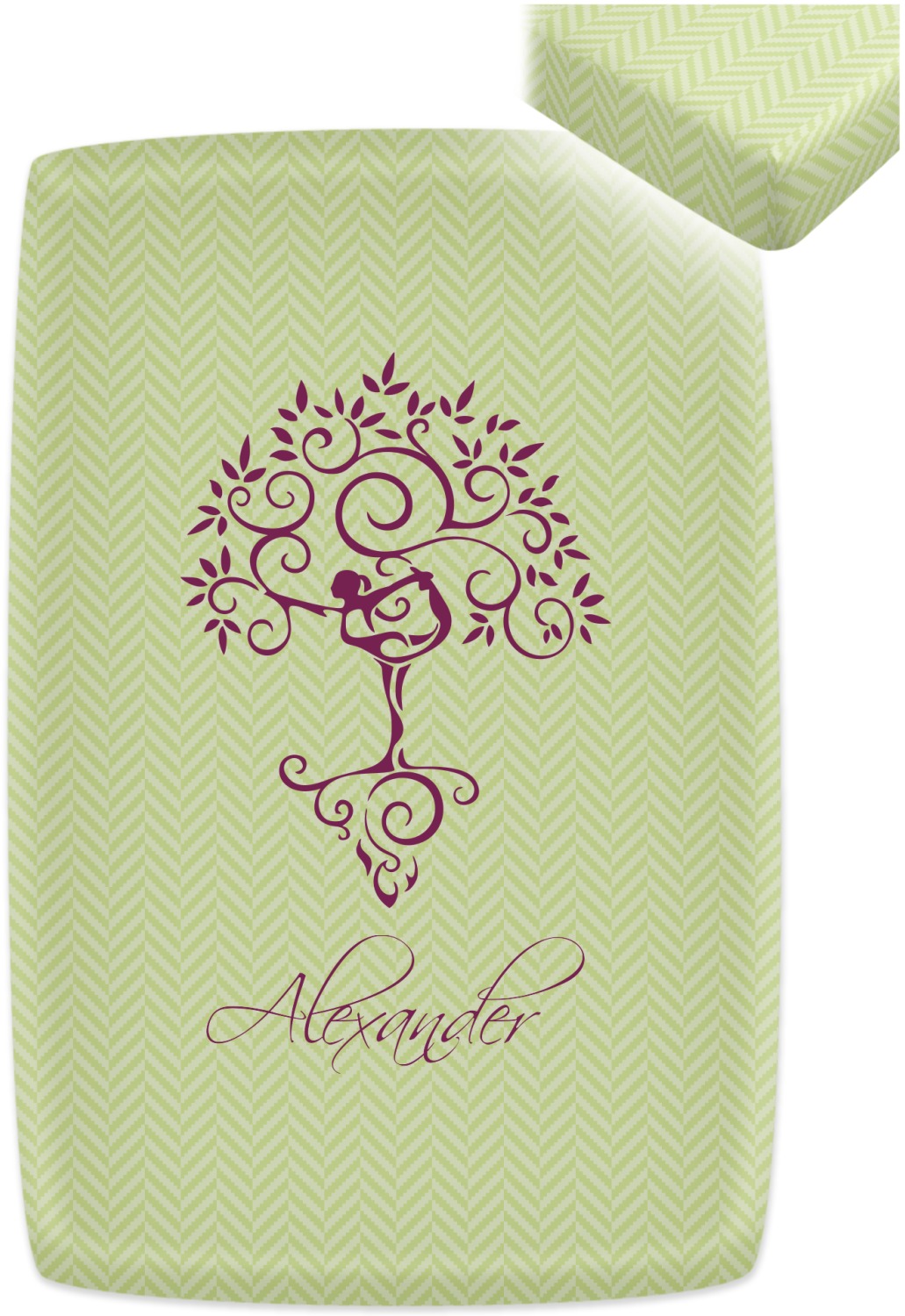 This design, set over a light lime-green chevron, is the epitome of elegance. A woman in a graceful yoga pose stands as still as a tree- in fact, she blends right into it.