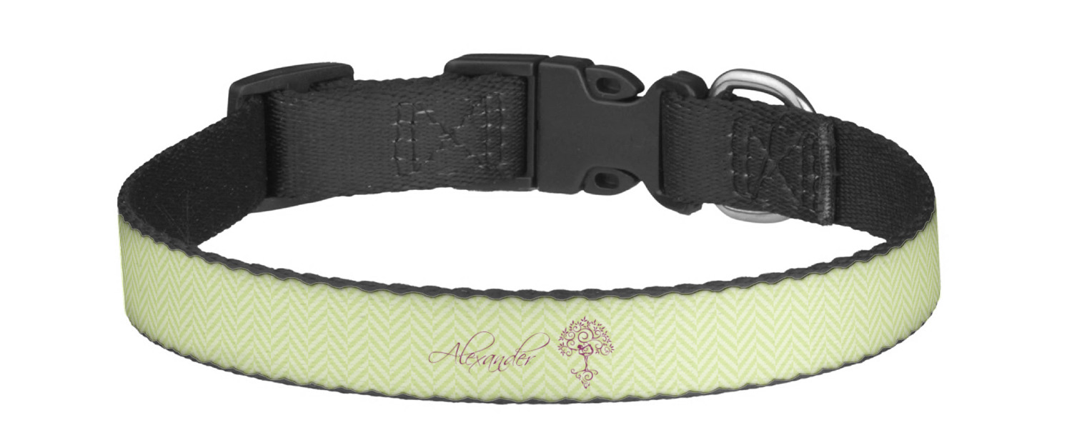 This sturdy collar, made from a durable nylon weave, will outlive your dog's episodes of excited tugging and pulling. Courtesy of its thick plastic buckle and adjuster, this collar is adjustable and accommodating of any dog. Structurally, the collar is a single piece of nylon weave that is sewn together, and features a solid metal loop where you can attach a leash or dog tag. We print and display your dog's name and pattern across the middle of the personalized dog collar.