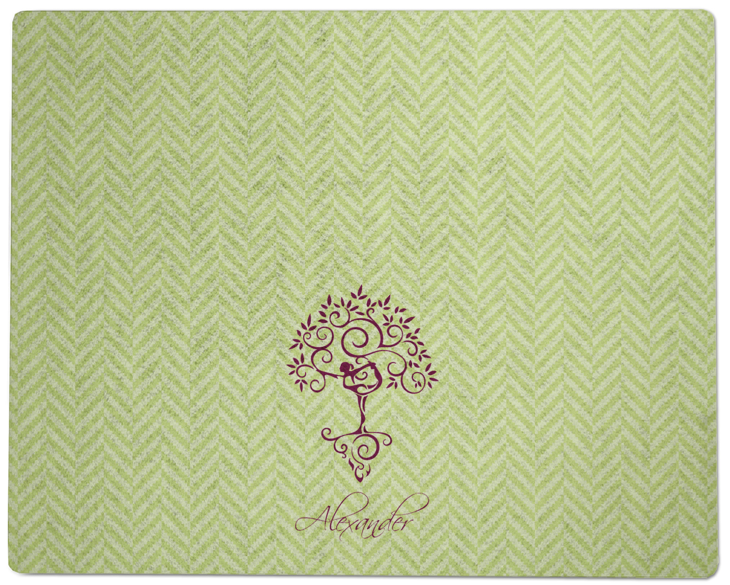 This design, set over a light lime-green chevron, is the epitome of elegance. A woman in a graceful yoga pose stands as still as a tree- in fact, she blends right into it.