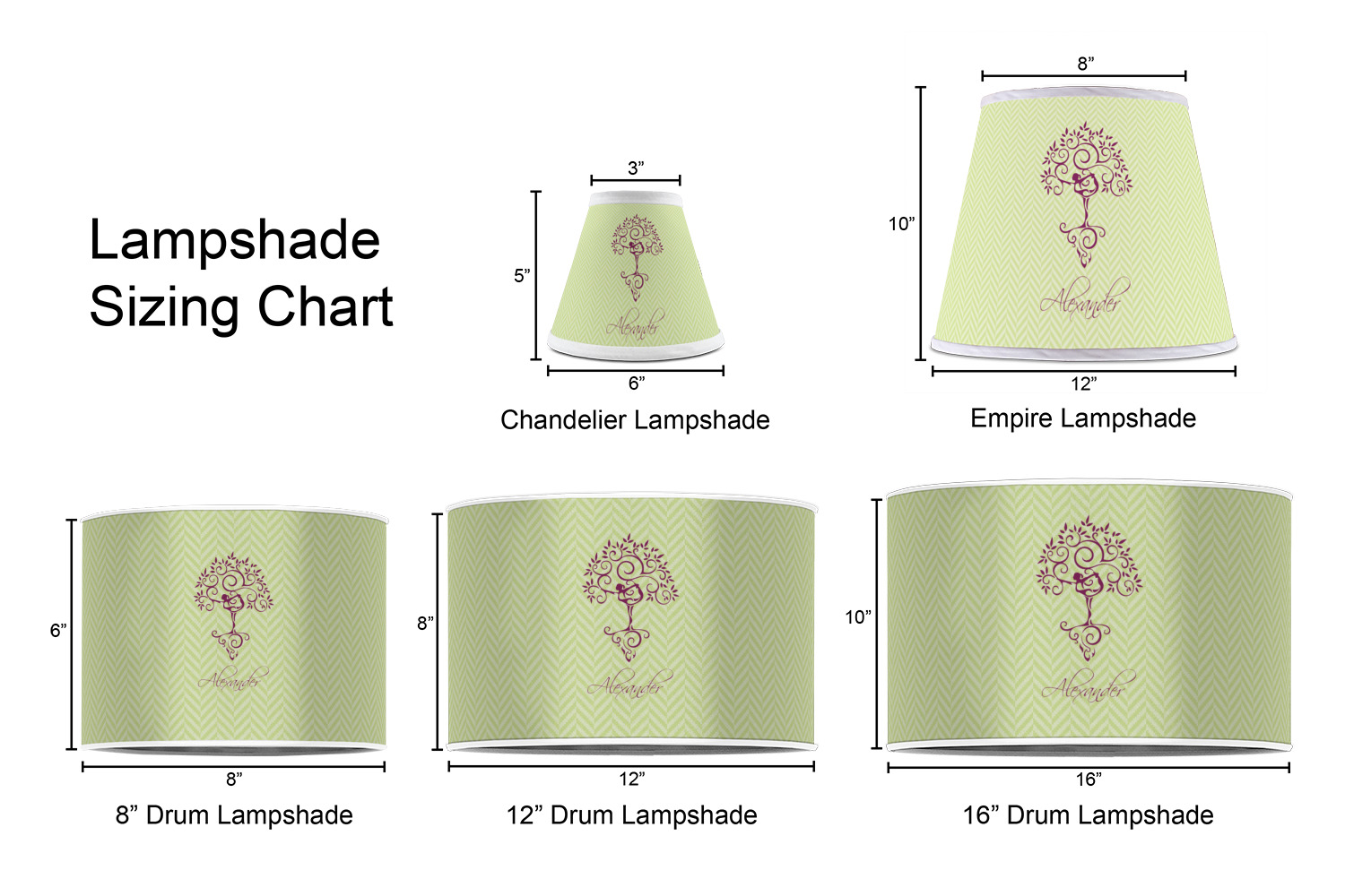 Our customized lamp shades also come in 3 different sizes: 8", 12" and 16", measuring at 8" in diameter by 6" tall, 12" in diameter by 8" tall, and 16" in diameter by 10" tall, respectively.