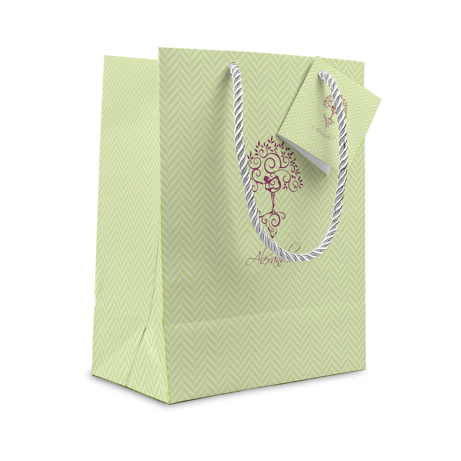 Our gift bags are digitally printed in full color on a premium heavy weight paper. The bags are then cut, scored & folded. The silver rope handles are then attached to the gift bag, along with the gift card.
