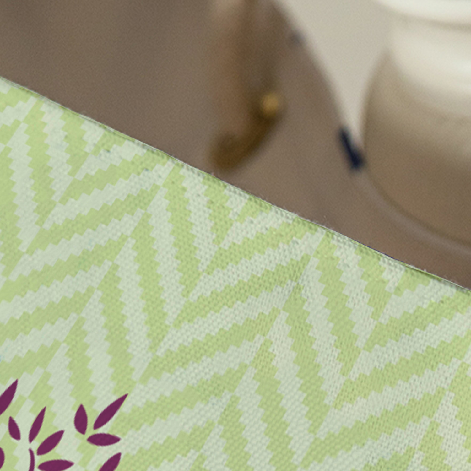 This design, set over a light lime-green chevron, is the epitome of elegance. A woman in a graceful yoga pose stands as still as a tree- in fact, she blends right into it.