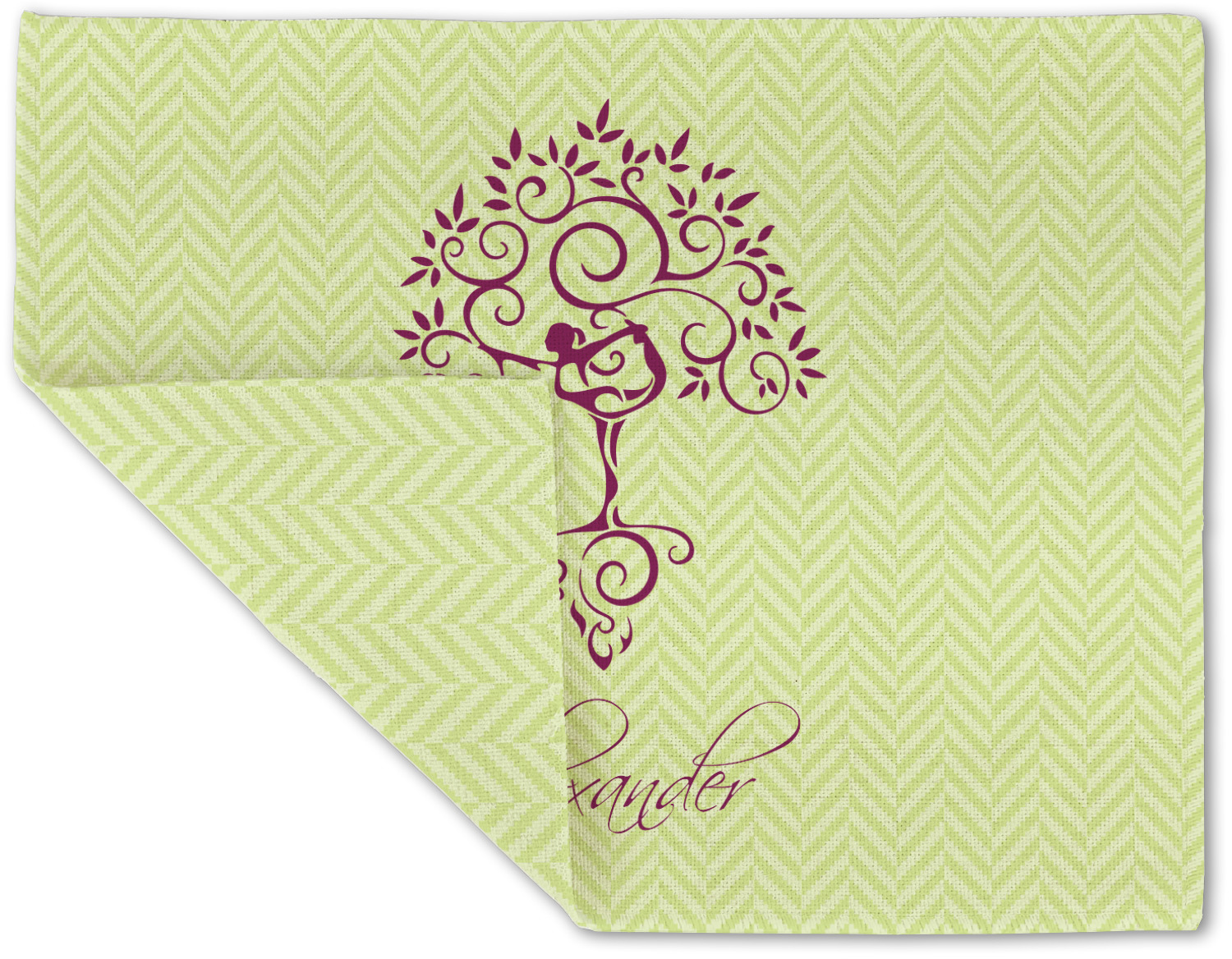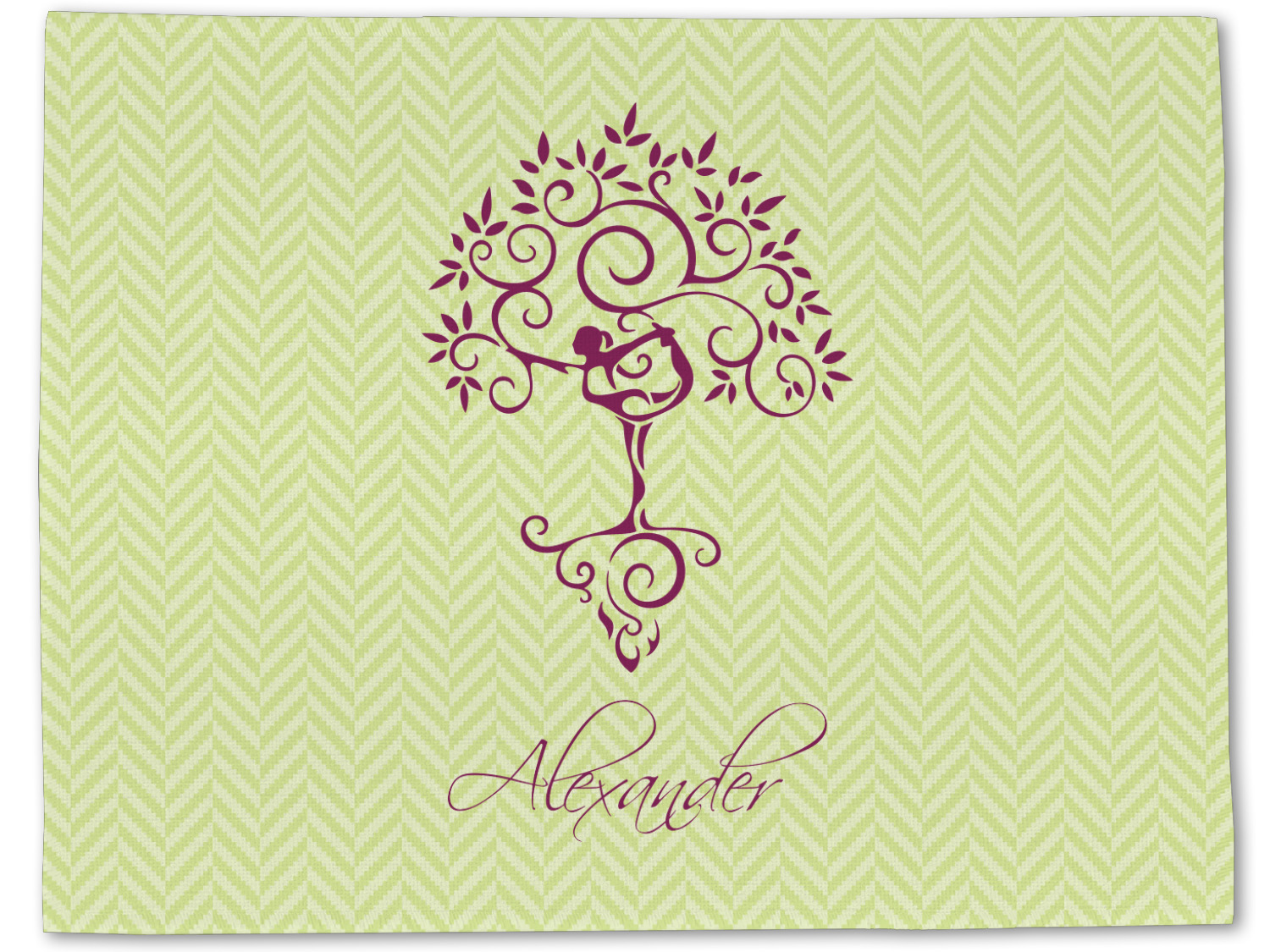 This design, set over a light lime-green chevron, is the epitome of elegance. A woman in a graceful yoga pose stands as still as a tree- in fact, she blends right into it.