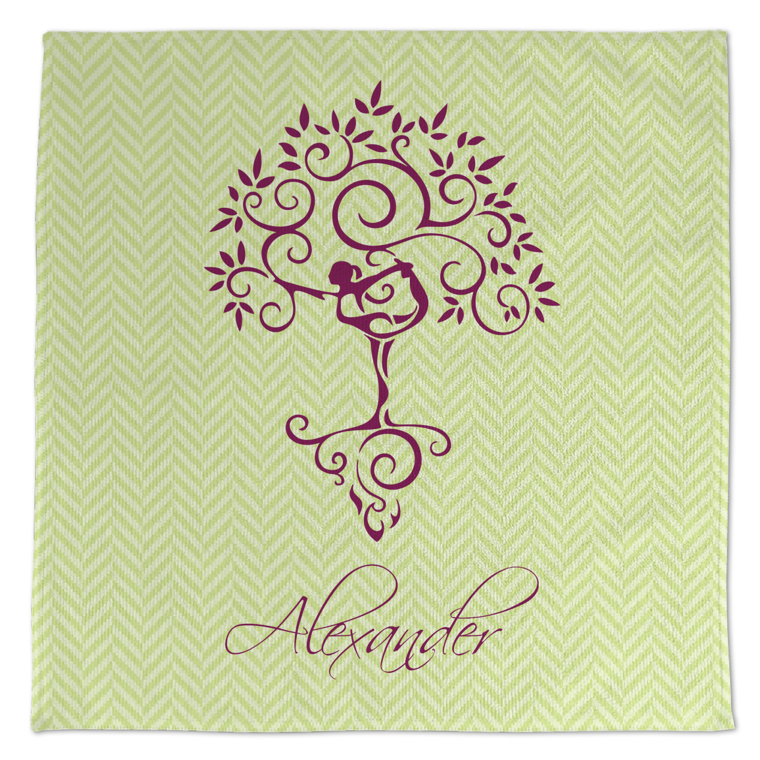 This design, set over a light lime-green chevron, is the epitome of elegance. A woman in a graceful yoga pose stands as still as a tree- in fact, she blends right into it.
