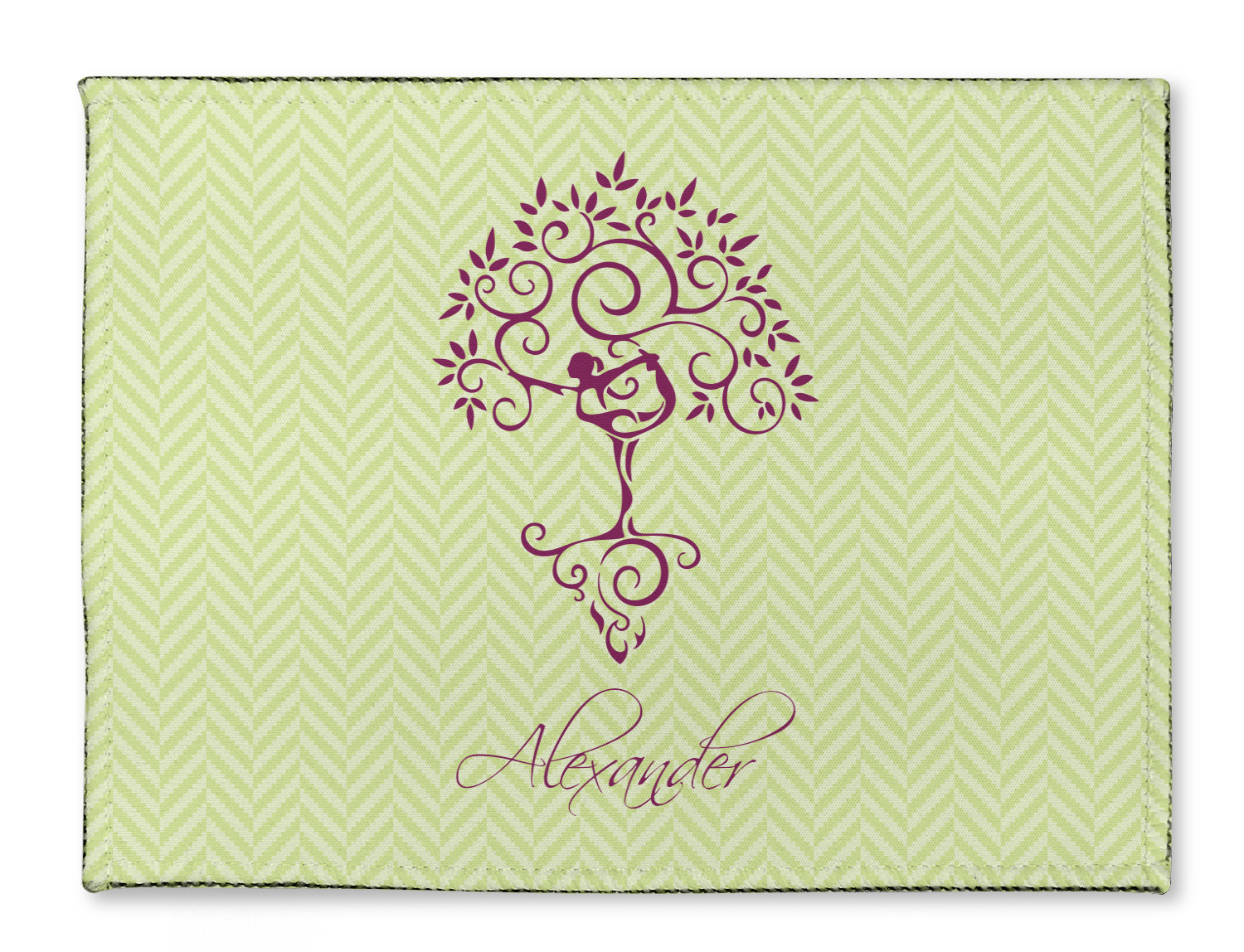 This design, set over a light lime-green chevron, is the epitome of elegance. A woman in a graceful yoga pose stands as still as a tree- in fact, she blends right into it.