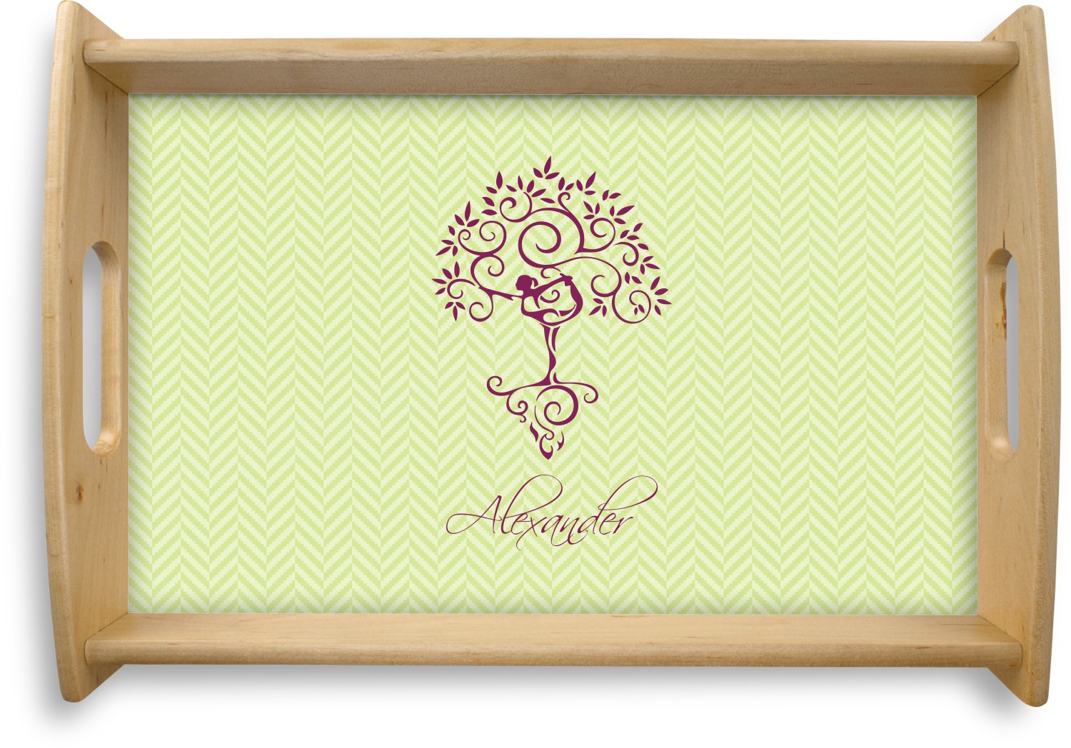 This serving tray with handles features square edges and two rounded sides, creating a very modern look. Each side is fabricated from a beautifully cut, natural wood. The bottom of the interior of the tray displays your customized design in bright, vibrant color. The tray is sold in both a black color and a natural wood look. Each variation of the wood serving tray has two sizes: Small, which is 14" x 10" x 2.25", and Large, which is 19.5" x 13.5" x 2.75".