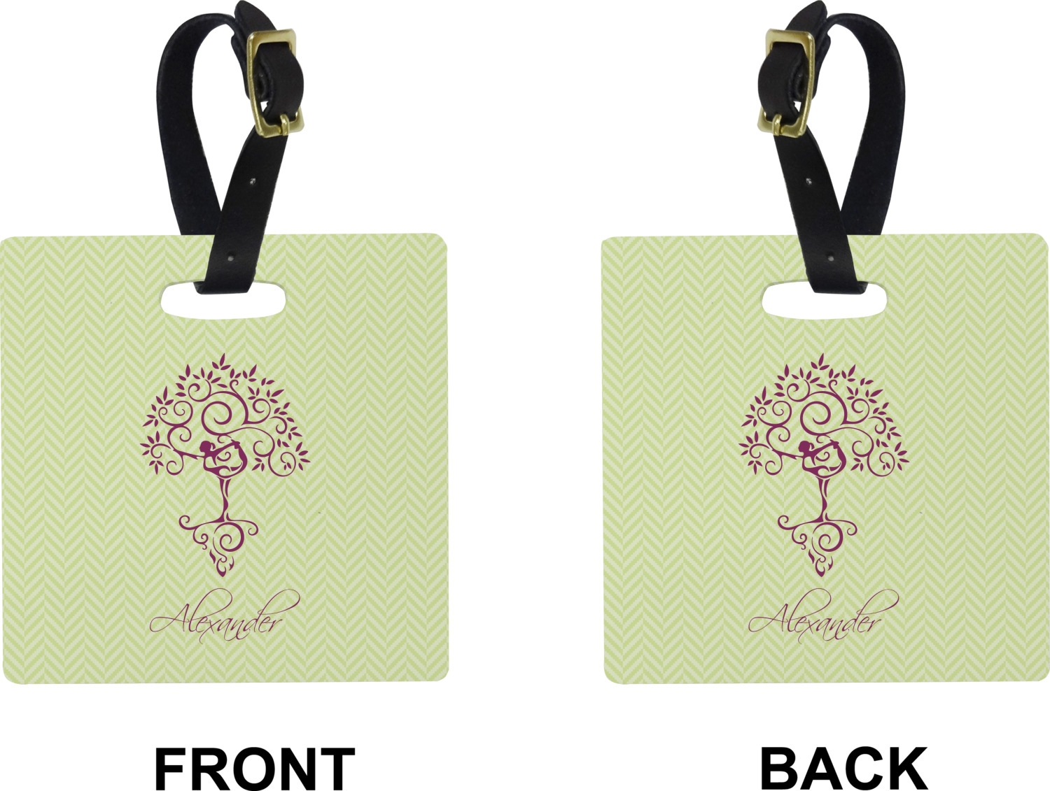 These personalized bag tags are sold in a variety of shapes, so that you may find the product that meets your vision exactly. We sell a round luggage tag, which measures at approximately 4" x 4". Our square luggage tag is about 3.5" x 3.5", while our rectangular version is 2.75" x 4 ".