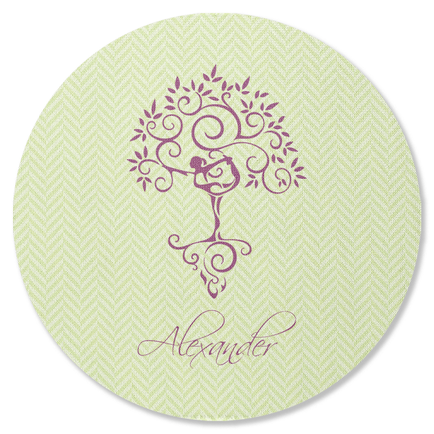 This design, set over a light lime-green chevron, is the epitome of elegance. A woman in a graceful yoga pose stands as still as a tree- in fact, she blends right into it.