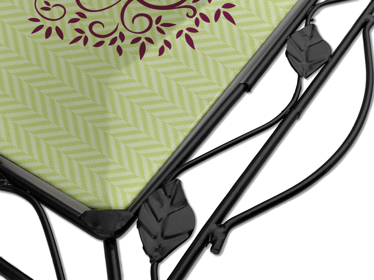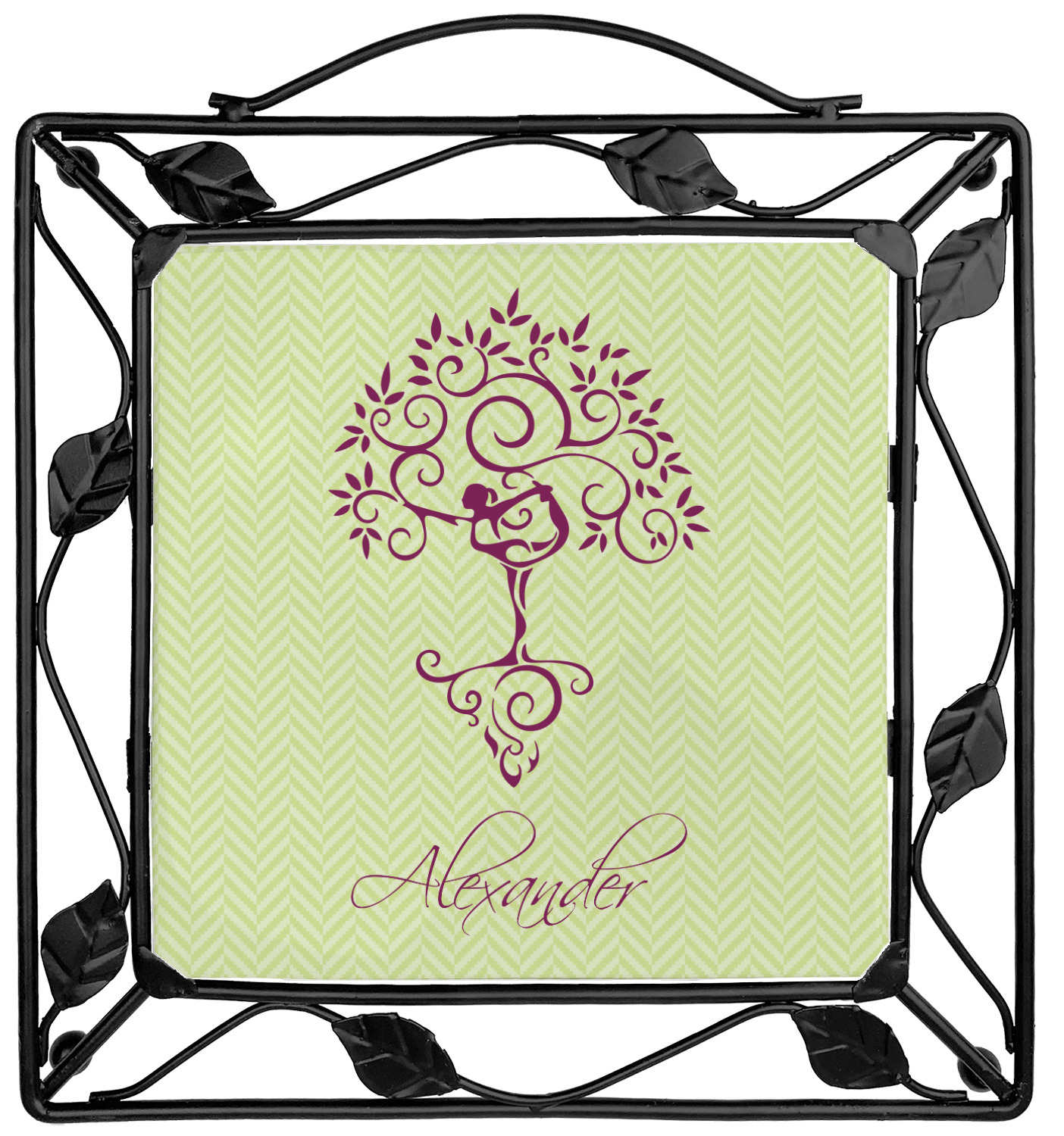 Our square trivets are made from a durable, wrought iron. This model features 4 small half circles, one on each corner, and a larger ring of iron that circles the central, customized tile. Each of the 4 corners has a round foot on its bottom for stability. This trivet is 8.75 by 8.75 inches, but the central tile measures at 6 inches on both sides.