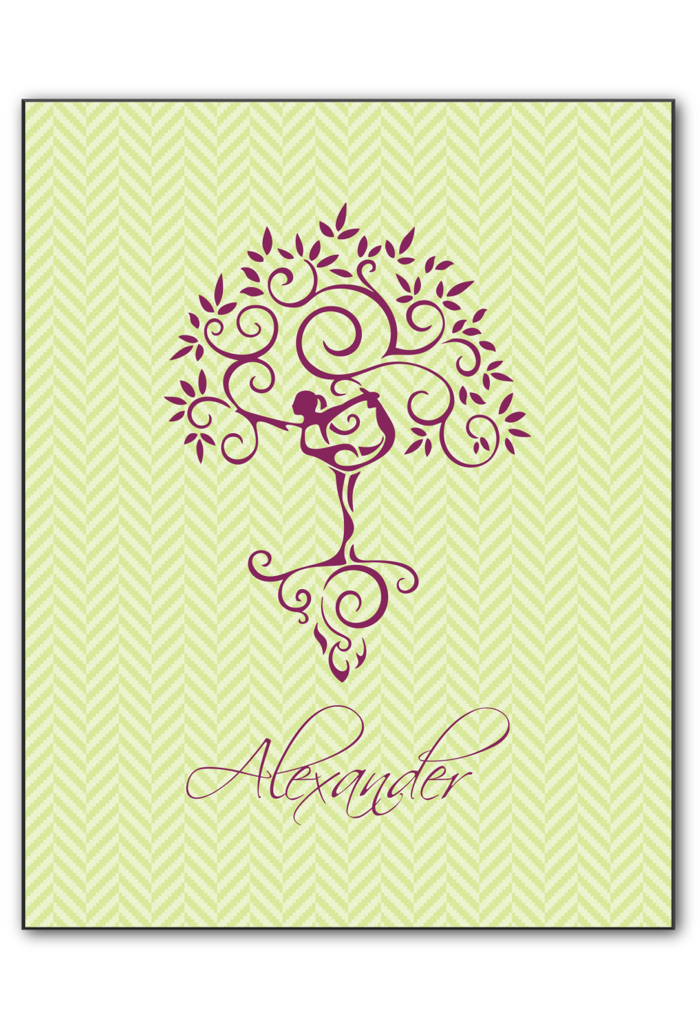 This design, set over a light lime-green chevron, is the epitome of elegance. A woman in a graceful yoga pose stands as still as a tree- in fact, she blends right into it.