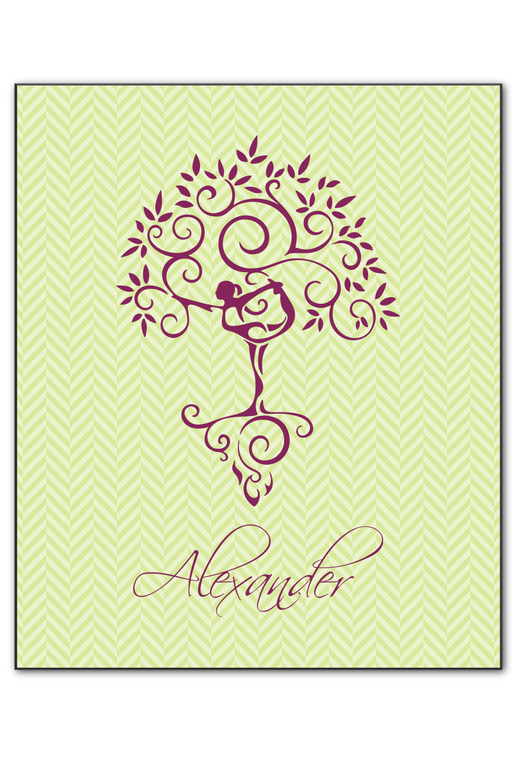 This design, set over a light lime-green chevron, is the epitome of elegance. A woman in a graceful yoga pose stands as still as a tree- in fact, she blends right into it.
