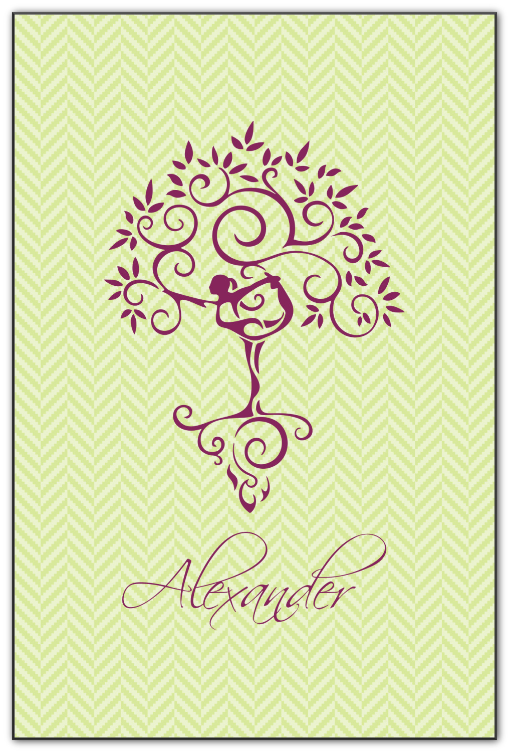 This design, set over a light lime-green chevron, is the epitome of elegance. A woman in a graceful yoga pose stands as still as a tree- in fact, she blends right into it.