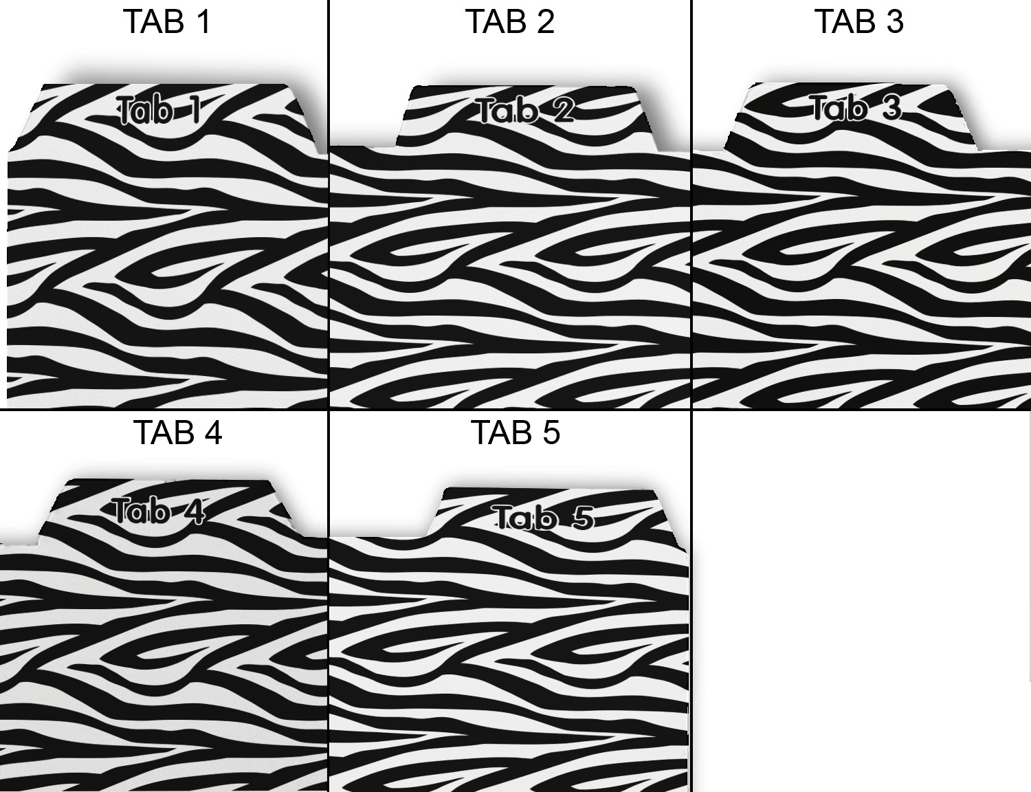 Whether you use binders at school or at work, we have designs to suit all of them. Available in 5 or 6 tab sets, you are sure to find a set to suit your needs. The back of each one is white and can be used to take notes, write vital information on, etc.