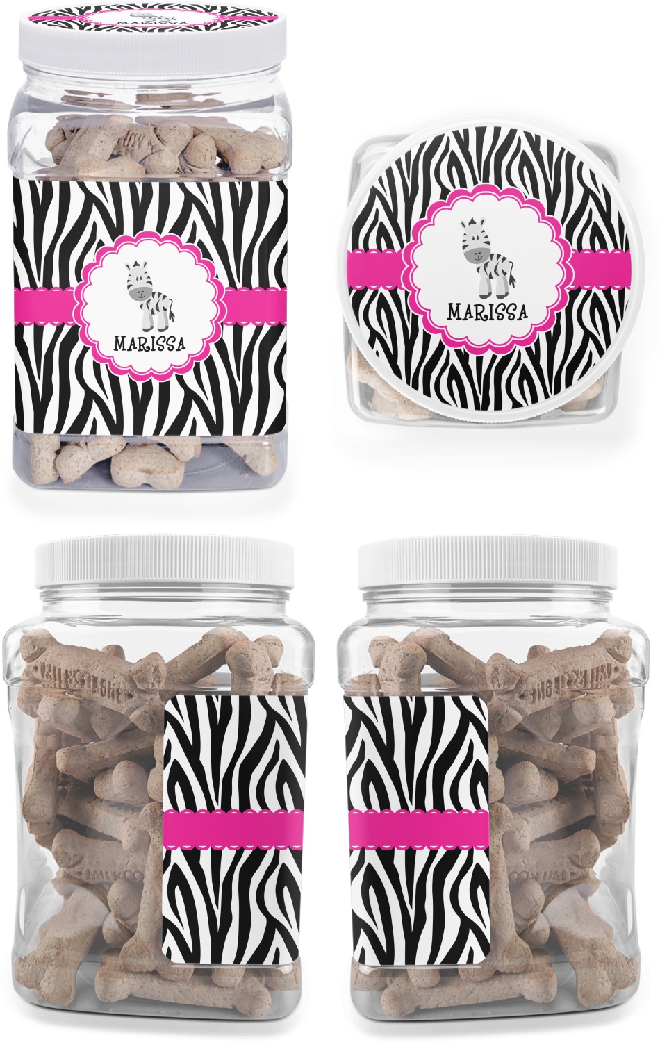 This half gallon jar, made from a sturdy plastic, is the perfect way to keep treats from any naughty pet paws, while still keeping them ready on hand for when your pup performs an impressive trick. This dog cookie jar features a screw-on, white lid that displays your personalized design on a vinyl sticker. We apply another customized sticker that wraps around the front and sides of the jar. Our dog treat jar also has indentations on the rear ends of the sides, which allows for convenient handling, and its square frame allows for easy storage.