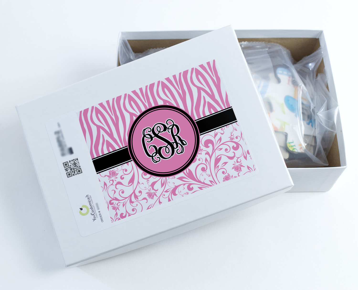 The cute ribbon in the center serves to separate the two beloved patterns and highlight a coordinating circle label that's the perfect place for your monogram.