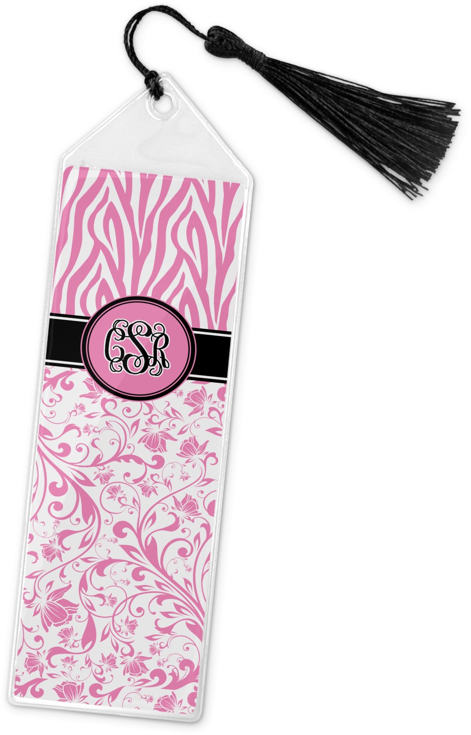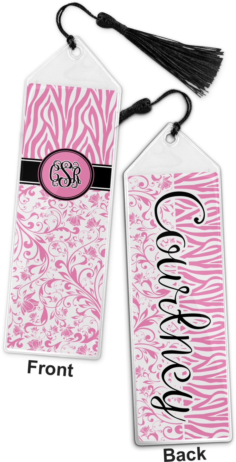 Your personalized bookmark is made of a sturdy, clear vinyl, and is approximately 7.5" x 2.25". We display your personalization on vinyl inserts that are placed on both sides. Accompanying each book marker is a black, fringe tassel that attaches to the reinforced, triangular header.
