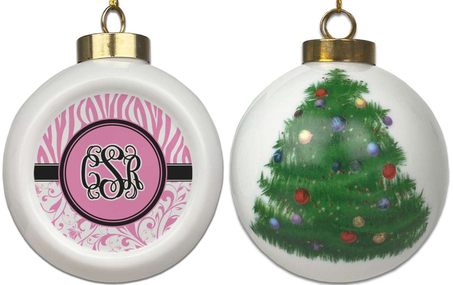 Our Christmas ornaments are a unique ceramic ball shape with a twist as it has a flat face to display your custom design! Select from one of our two design types - Christmas Tree or Poinsettia Garland - to adorn the curved back of your personal design. Each ornament measures 3H x 2.5W x 2D accompanied with a gold string accent for finishing touches to hang on your beautiful Christmas tree!