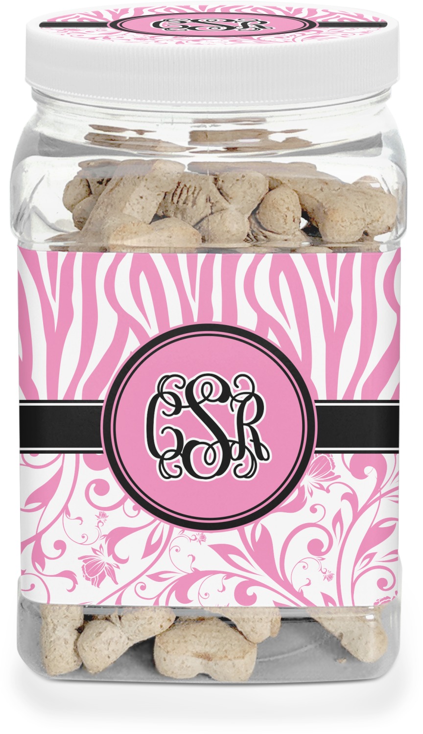 This half gallon jar, made from a sturdy plastic, is the perfect way to keep treats from any naughty pet paws, while still keeping them ready on hand for when your pup performs an impressive trick. This dog cookie jar features a screw-on, white lid that displays your personalized design on a vinyl sticker. We apply another customized sticker that wraps around the front and sides of the jar. Our dog treat jar also has indentations on the rear ends of the sides, which allows for convenient handling, and its square frame allows for easy storage.