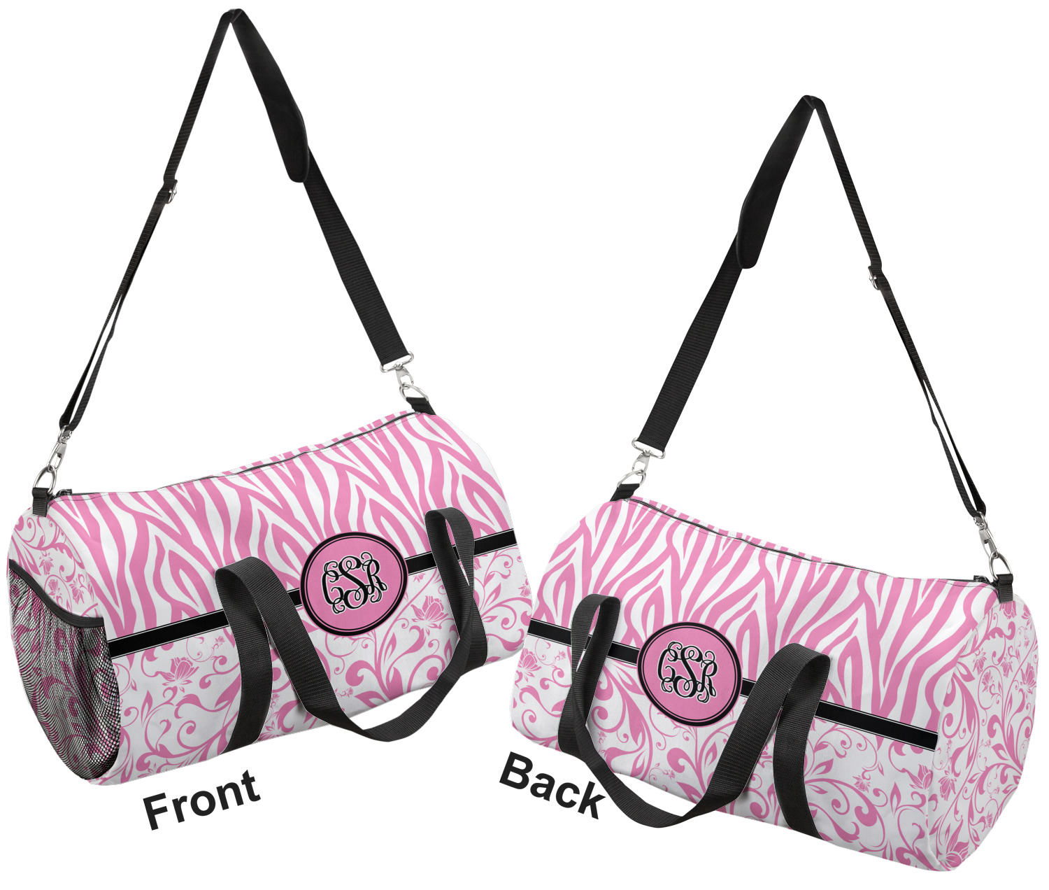 This duffle is a sturdy bag made of a canvas material. It comes in two sizes: Small (19"W x 9.5"H x 9.5"D) and Large (23"W x 12"H x 12"D). The bag is a cylindrical shape with a black adjustable strap and two handles. On one side is an elastic pouch to put a waterbottle or other small item. Your product will be sublimated with your design and is able to be designed on the front, back, and sides. Be sure to remember that the straps may cut into parts of your design if you upload your own artwork.