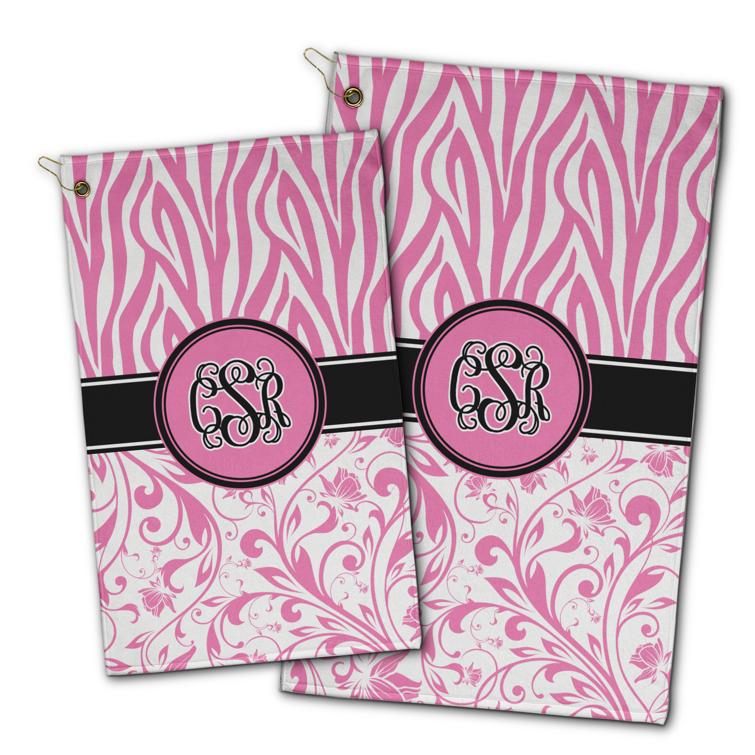 The towel is fully printed / patterned on the front polyester side; and is white on terrycloth cotton backside. The towel has grommet and a pear spring clip in the top left corner. Our golf towels are available in 100s of different prints and patterns.