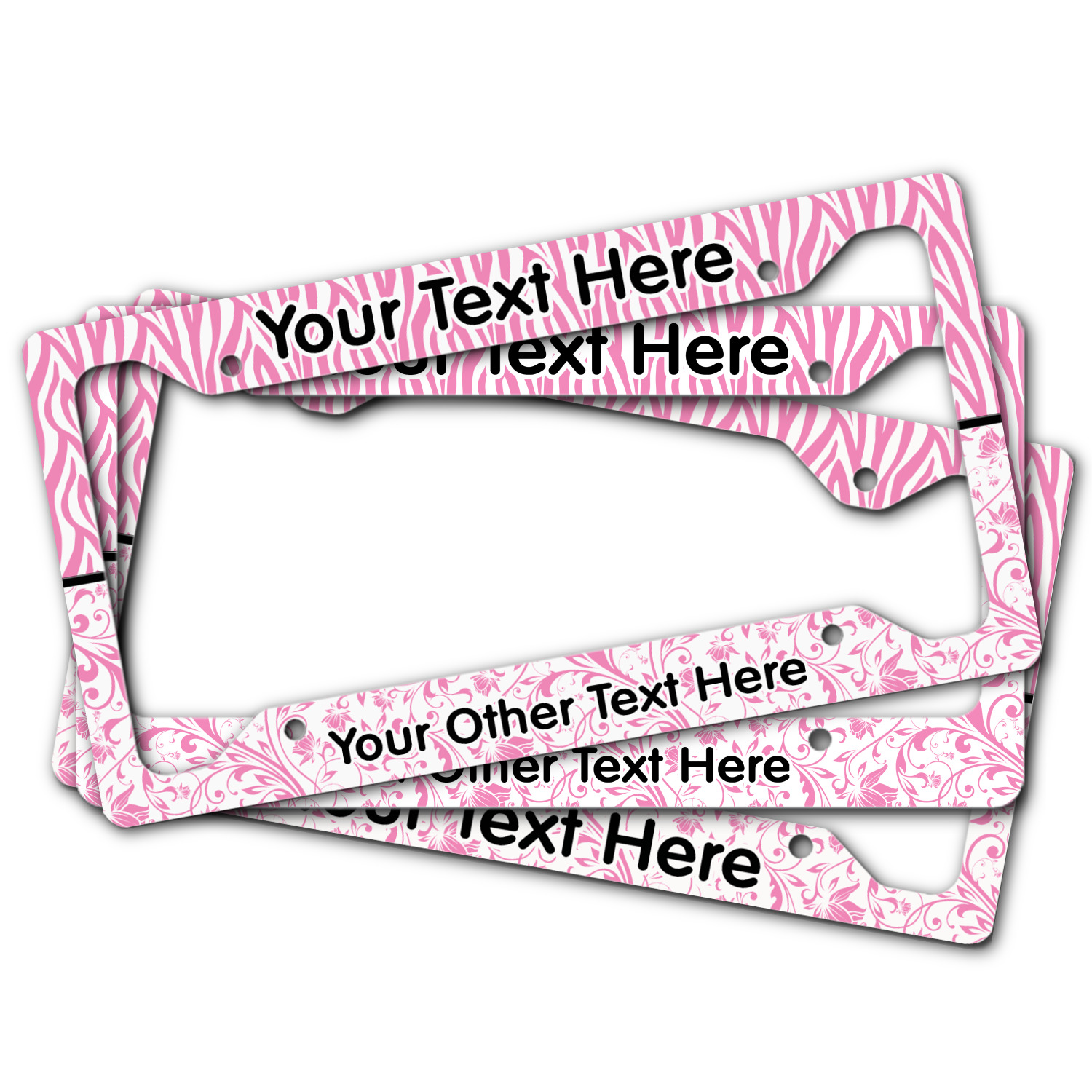 Each customizable license plate frame is made from a fine, yet sturdy aluminum material that measures approximately 6.5 x 12.15 inches, accommodating most standard license plates. The thickness allows the license plate frame to adhere completely to your license plate for a seamless look. We carry 3 styles of license plate frames to customize - Style A has texts on top and bottom, Style B offers texts on top and bottom as well as a full fill bottom border, and Style C offers text at the bottom only. The personalized license plate frame comes with four mounting holes for easy installation! We print each custom design across the frame with a glossy finish.