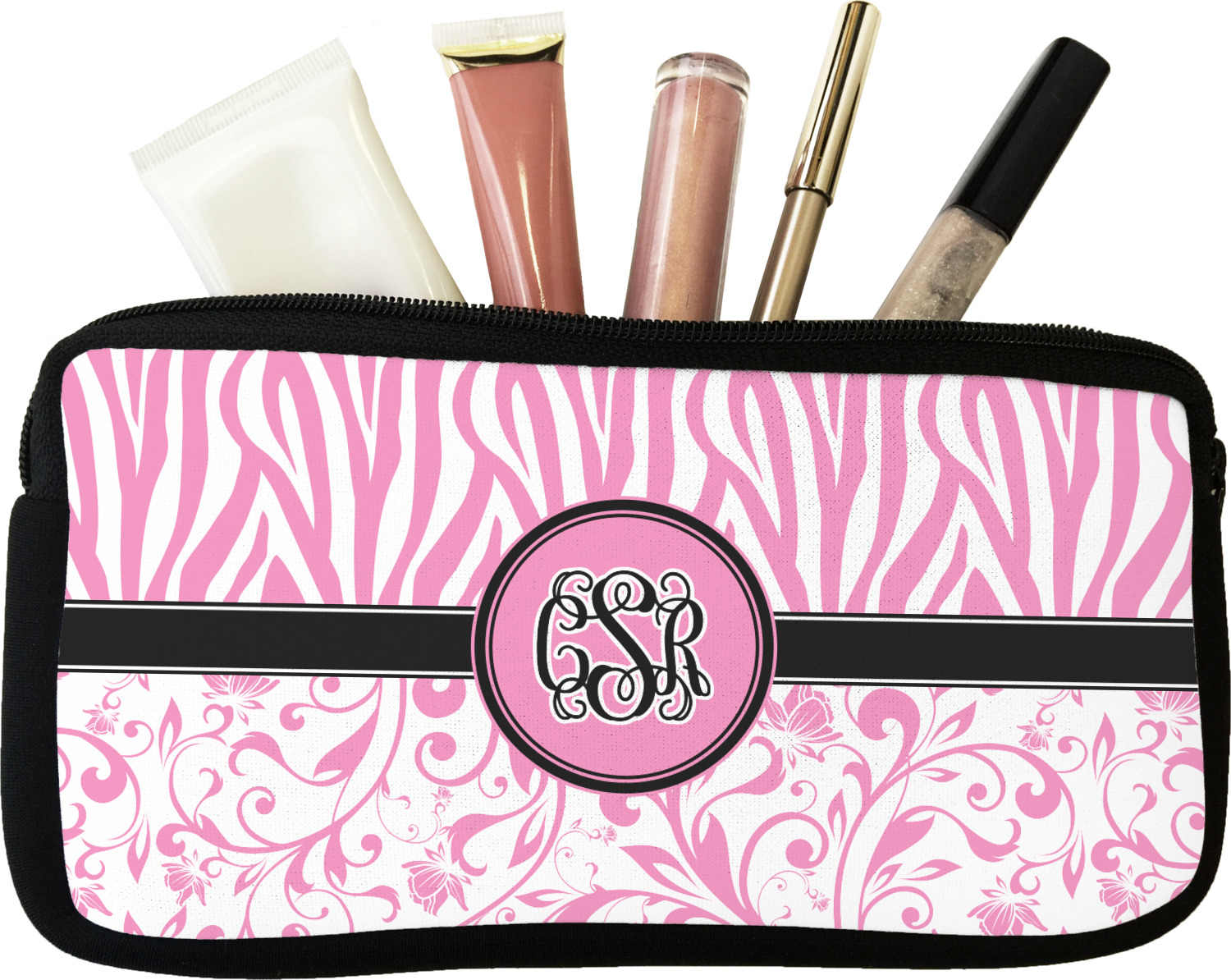 Our personalized makeup bags are available in many different designs, patterns and colors - so you are sure to find one that will love. They are made of neoprene (same material as wet-suits) and thus are water resistant, so spillages in your makeup bag will not end up all over you purse. They are customized on one side and are black on the other side and the zipper is black as well.