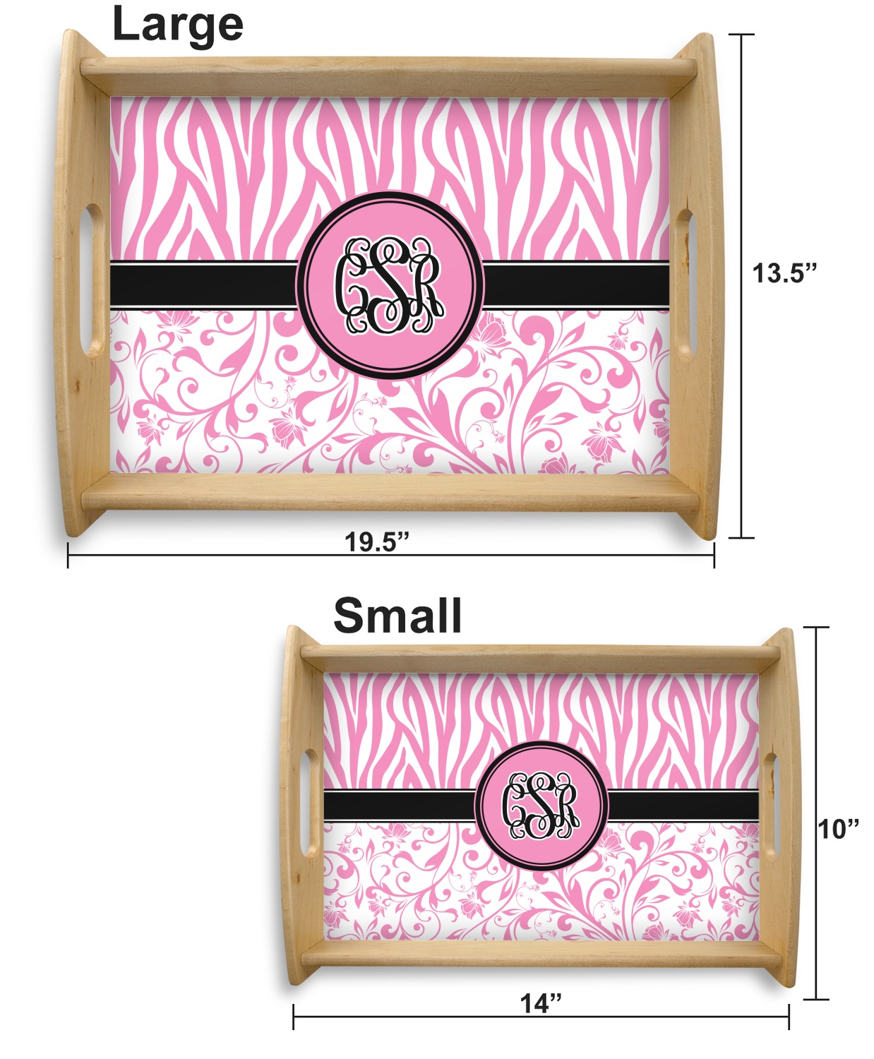 This serving tray with handles features square edges and two rounded sides, creating a very modern look. Each side is fabricated from a beautifully cut, natural wood. The bottom of the interior of the tray displays your customized design in bright, vibrant color. The tray is sold in both a black color and a natural wood look. Each variation of the wood serving tray has two sizes: Small, which is 14" x 10" x 2.25", and Large, which is 19.5" x 13.5" x 2.75".