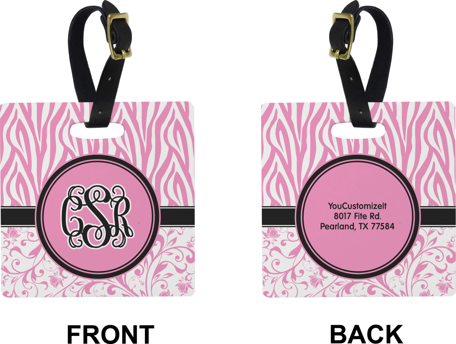 These personalized bag tags are sold in a variety of shapes, so that you may find the product that meets your vision exactly. We sell a round luggage tag, which measures at approximately 4" x 4". Our square luggage tag is about 3.5" x 3.5", while our rectangular version is 2.75" x 4 ".