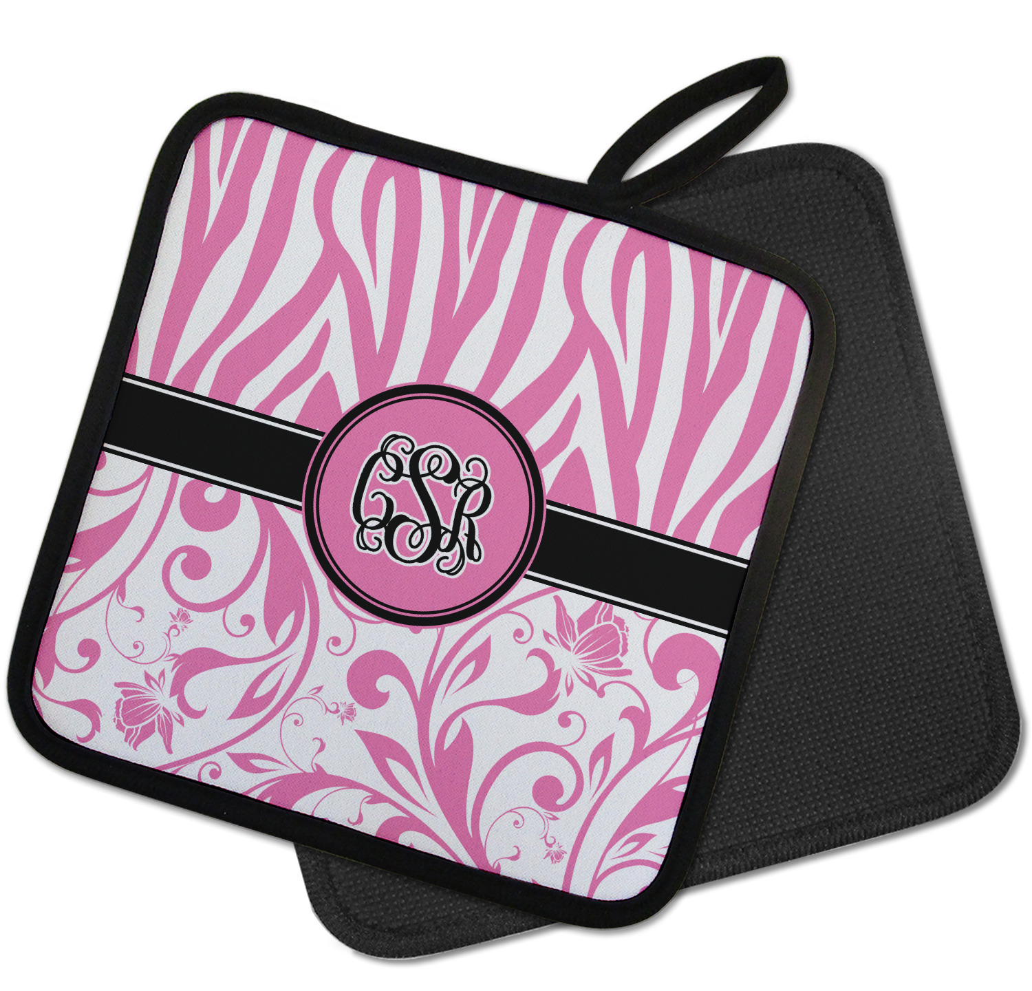Our personalized pot holders feature a neoprene front that displays your personalization in vibrant colors. The backing of the hot pot holder is rubberized; the textured backing allows you to have a great grip when using this custom pot holder. The two materials are joined with a sleek, black trim, and the holder also includes an attached loop for hanging and storage. The pot holder is approximately 8.75 inches by 8.75 inches and 0.25 inches tall, while the fabric loop is 2.5 inches long. You can purchase a kitchen pot holder by itself or as a set of 2. We also offer a set including one pot holder and one oven mitt.