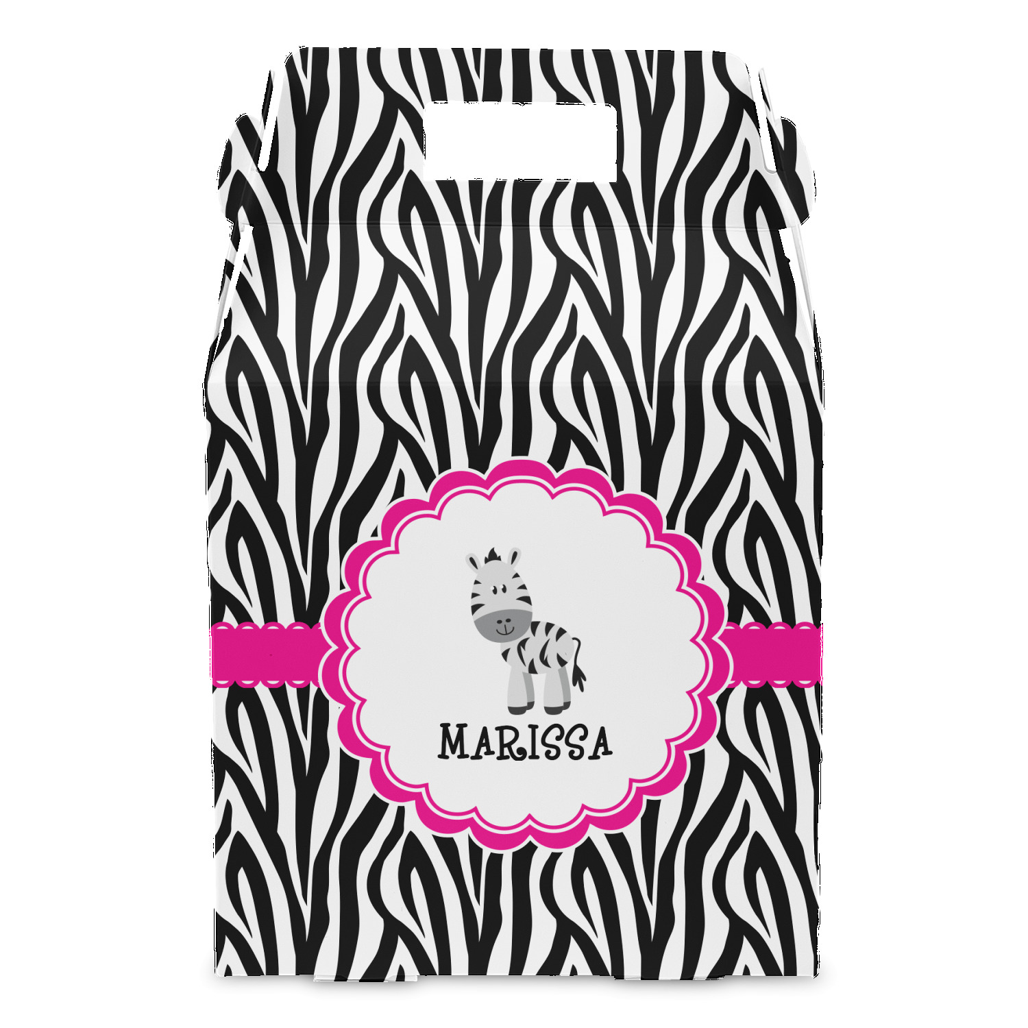 This cute band highlights a scalloped coordinating circle label featuring an adorable zebra. Underneath the zebra there is ample room for personalization of your choice.