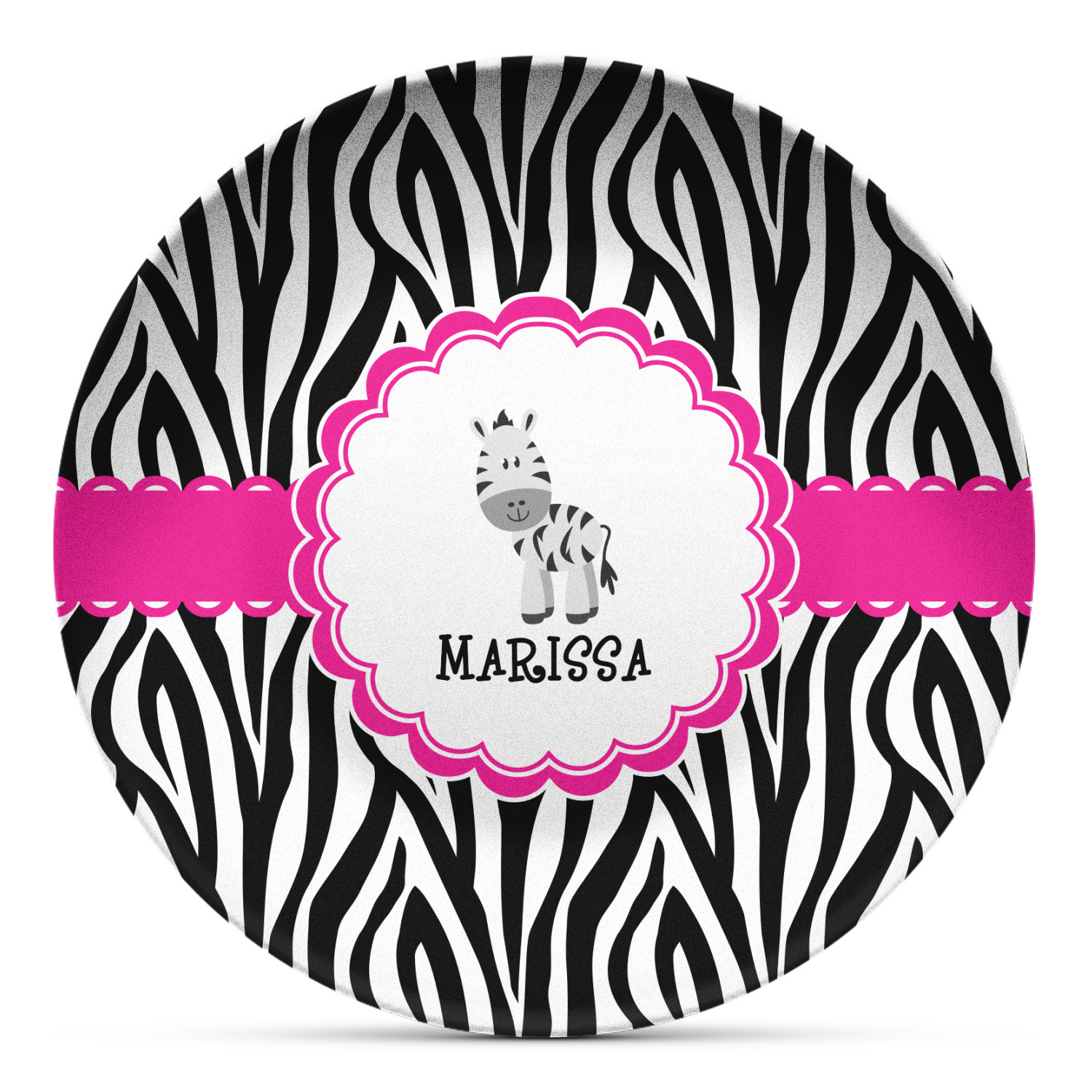 This cute band highlights a scalloped coordinating circle label featuring an adorable zebra. Underneath the zebra there is ample room for personalization of your choice.
