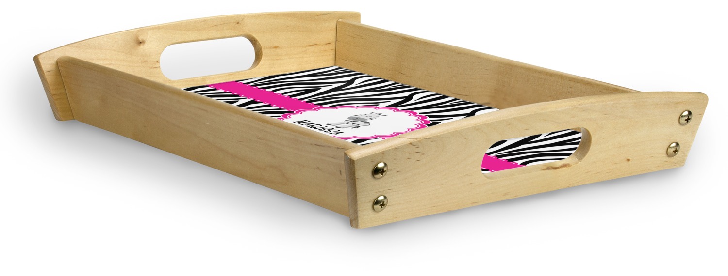 This serving tray with handles features square edges and two rounded sides, creating a very modern look. Each side is fabricated from a beautifully cut, natural wood. The bottom of the interior of the tray displays your customized design in bright, vibrant color. The tray is sold in both a black color and a natural wood look. Each variation of the wood serving tray has two sizes: Small, which is 14" x 10" x 2.25", and Large, which is 19.5" x 13.5" x 2.75".