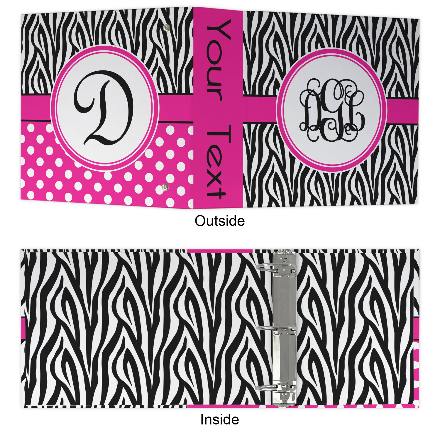 Made from a sturdy cardboard base with a full high quality canvas textured vinyl wrap with the design of your choice. Unlike our standard 3-ring binder with the full wrap design your artwork wraps from the front and back and into the inside of the binder.