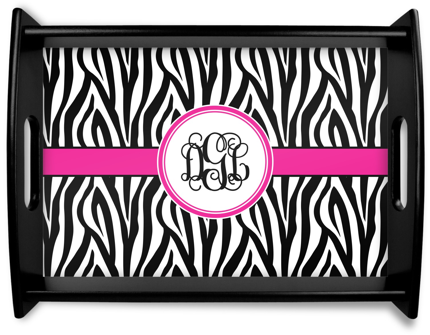 This serving tray with handles features square edges and two rounded sides, creating a very modern look. Each side is fabricated from a beautifully cut, natural wood. The bottom of the interior of the tray displays your customized design in bright, vibrant color. The tray is sold in both a black color and a natural wood look. Each variation of the wood serving tray has two sizes: Small, which is 14" x 10" x 2.25", and Large, which is 19.5" x 13.5" x 2.75".