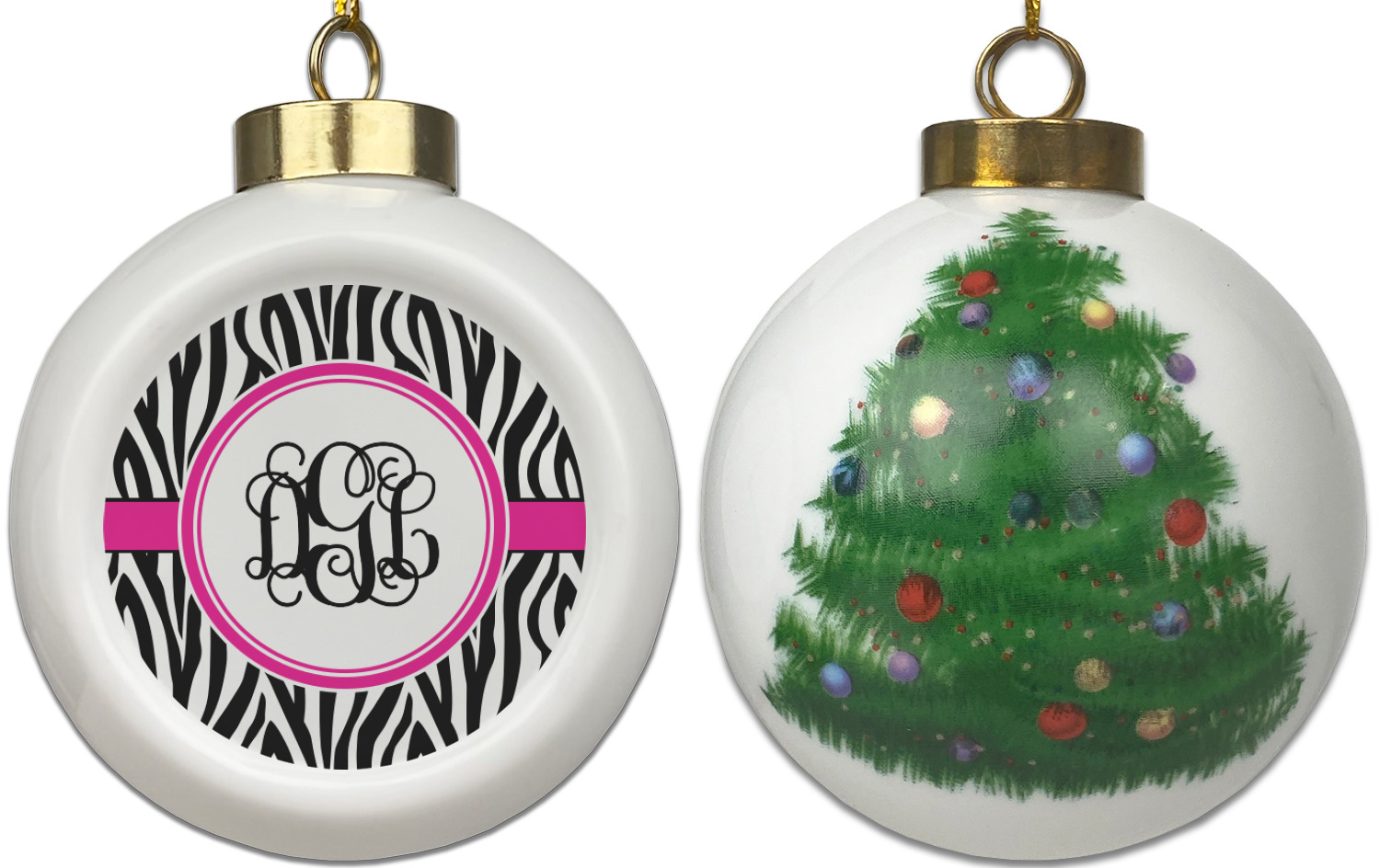 Our Christmas ornaments are a unique ceramic ball shape with a twist as it has a flat face to display your custom design! Select from one of our two design types - Christmas Tree or Poinsettia Garland - to adorn the curved back of your personal design. Each ornament measures 3H x 2.5W x 2D accompanied with a gold string accent for finishing touches to hang on your beautiful Christmas tree!