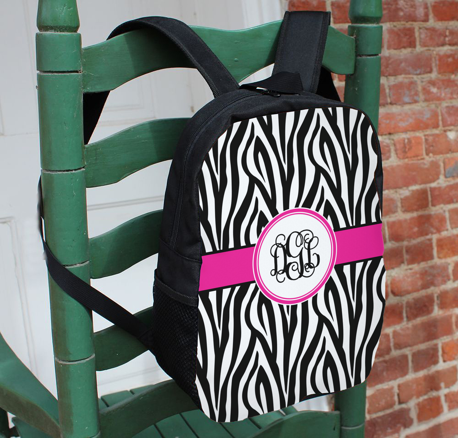 These small backpacks are made of a durable black canvas material with your personalization right on the front. The two shoulder straps are padded and easily adjustable. The bag itself measures at about 11" W x 15" H x 5" D. It's the perfect size for elementary aged kids or adults who want a smaller backpack. On the top of the bag you will find a handle to hang or carry your backpack by as well as a large zipper closure to keep all of your belongings safe inside. On each side of your backpack is a mesh pocket for a small item or water bottle. Inside your backpack you will find a spacious area with a small zipper pocket and a padded laptop slot that will fit up to a 13" laptop (13" being very snug). This is the perfect bag for any student that needs a couple books and their laptop with them at all times. It also works great as a carry on for traveling!
