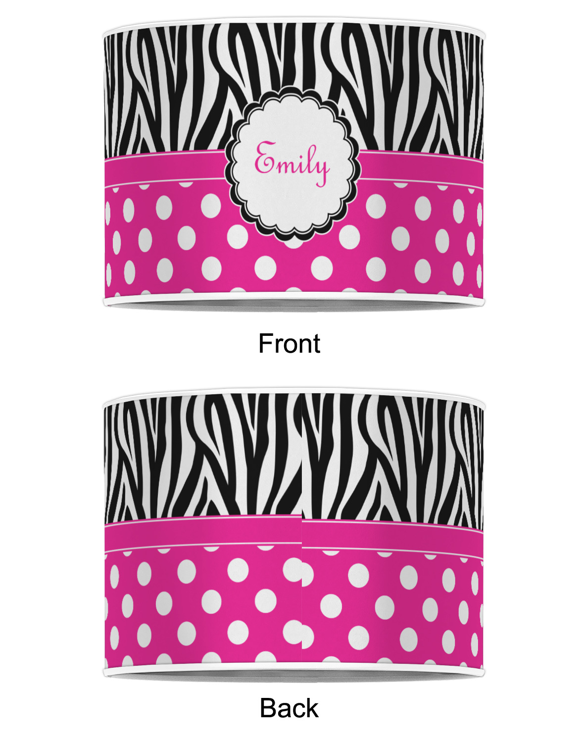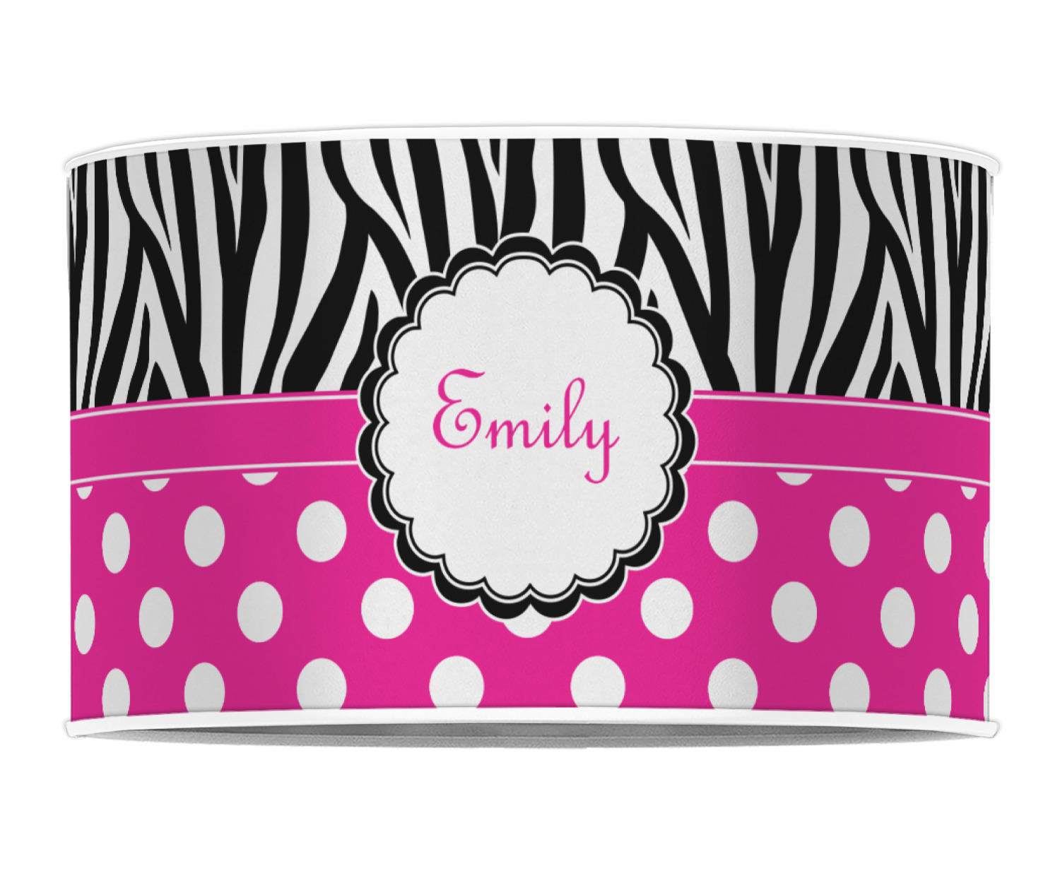 A white scalloped circle label edged in black highlights the personalization of your choice. A wide hot pink band trimmed in white completes the design.