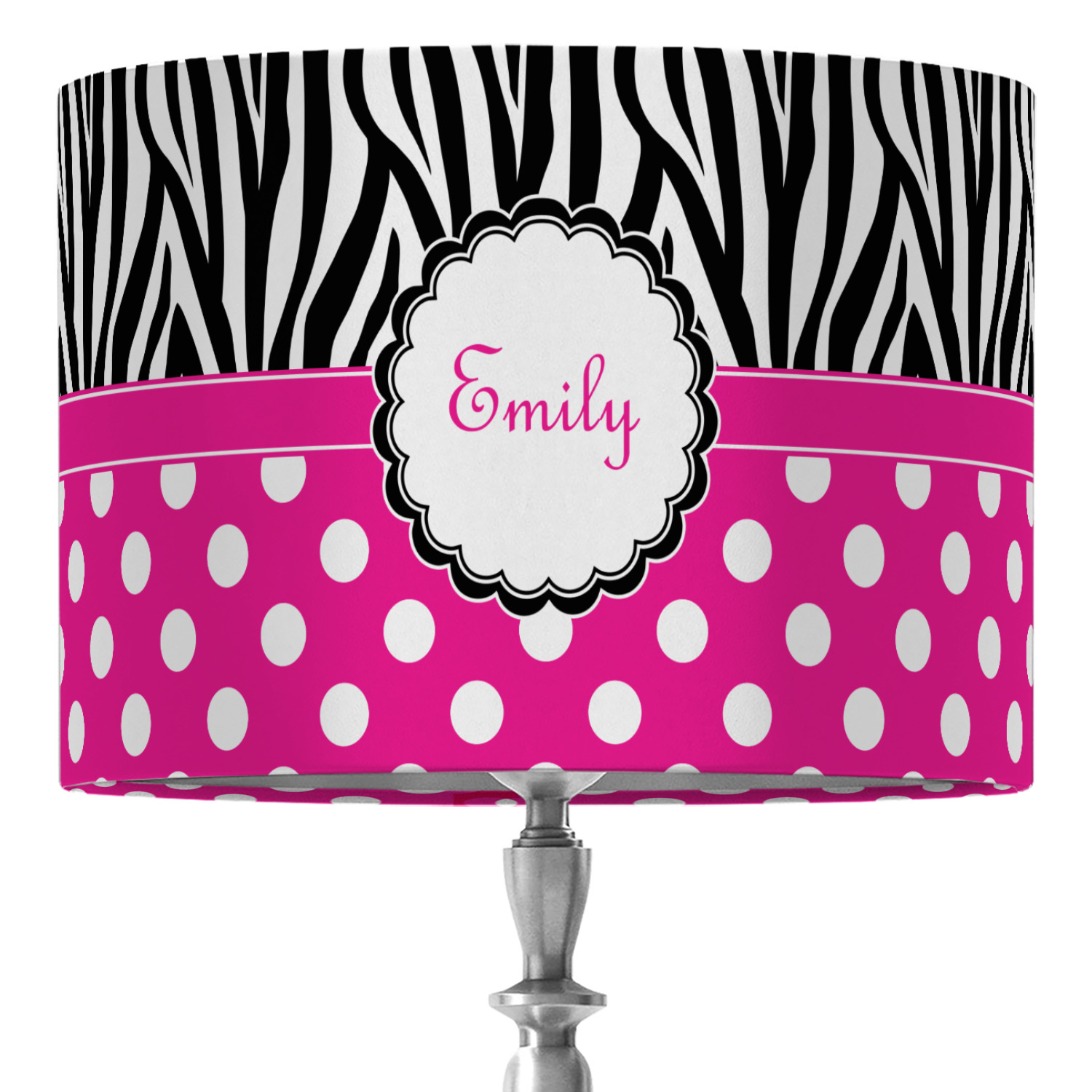 A white scalloped circle label edged in black highlights the personalization of your choice. A wide hot pink band trimmed in white completes the design.