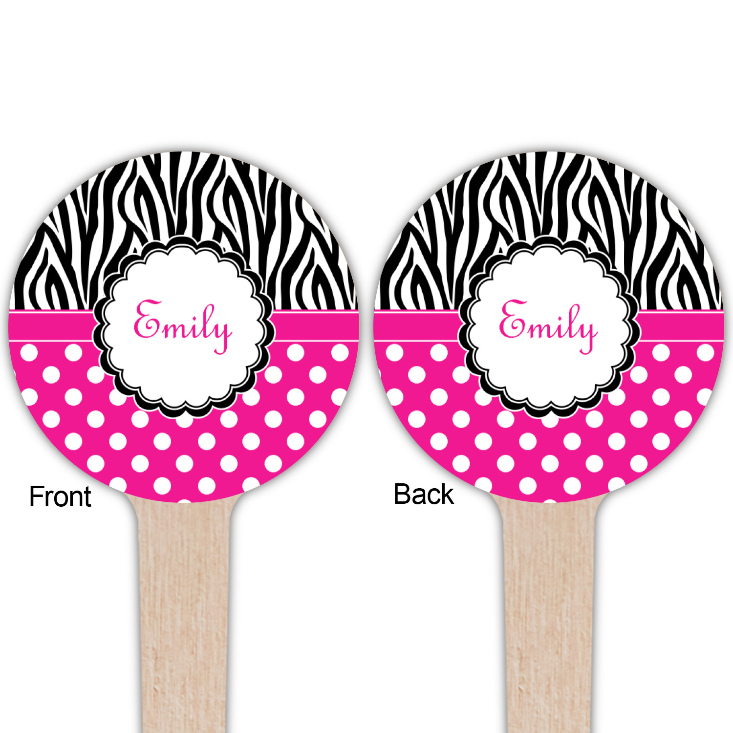 A white scalloped circle label edged in black highlights the personalization of your choice. A wide hot pink band trimmed in white completes the design.