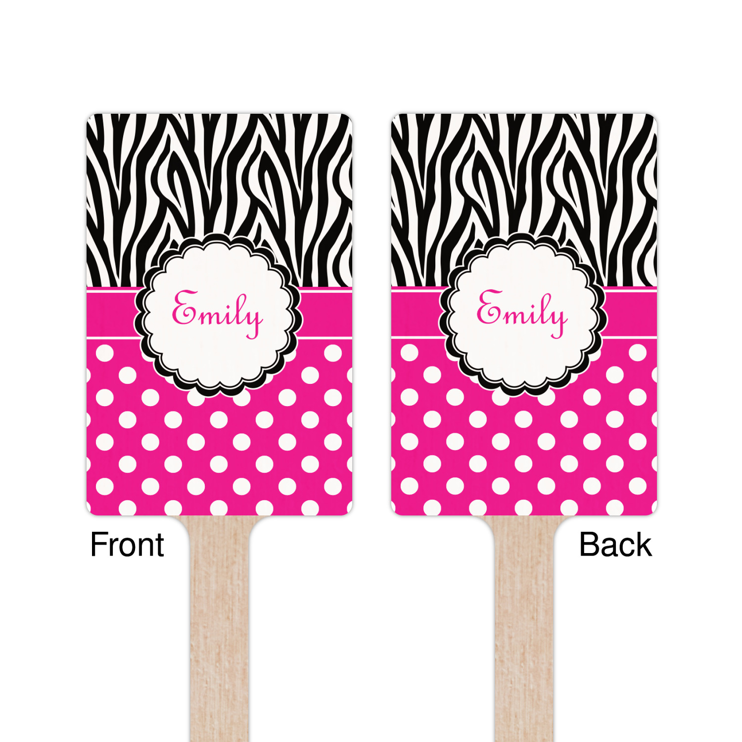 A white scalloped circle label edged in black highlights the personalization of your choice. A wide hot pink band trimmed in white completes the design.