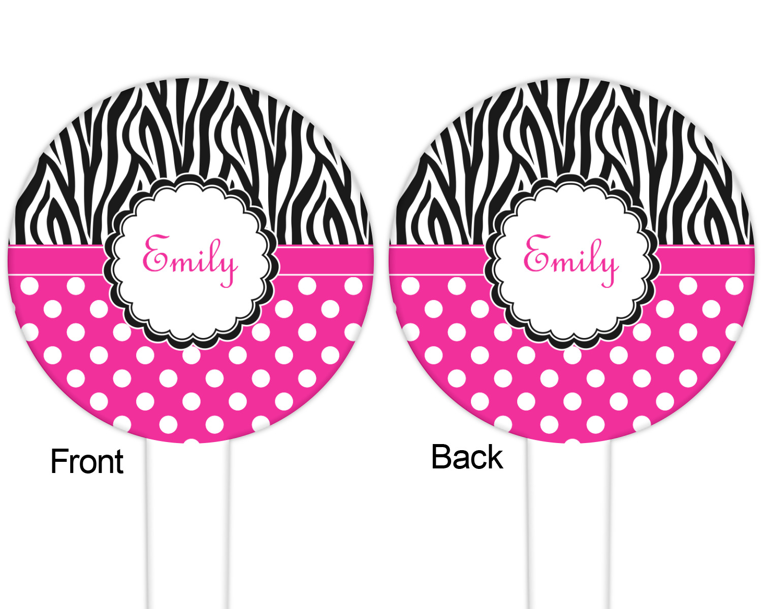 A white scalloped circle label edged in black highlights the personalization of your choice. A wide hot pink band trimmed in white completes the design.