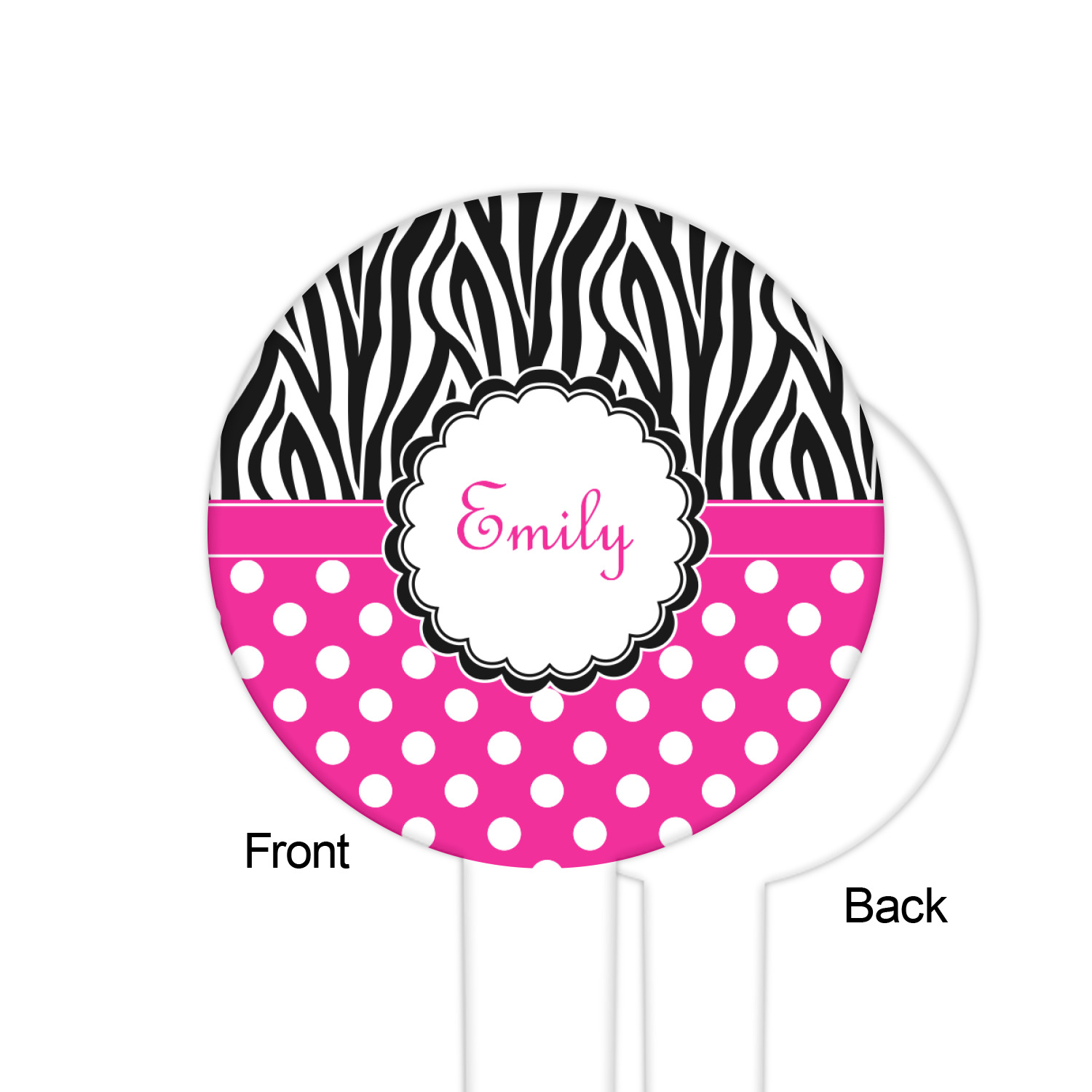A white scalloped circle label edged in black highlights the personalization of your choice. A wide hot pink band trimmed in white completes the design.