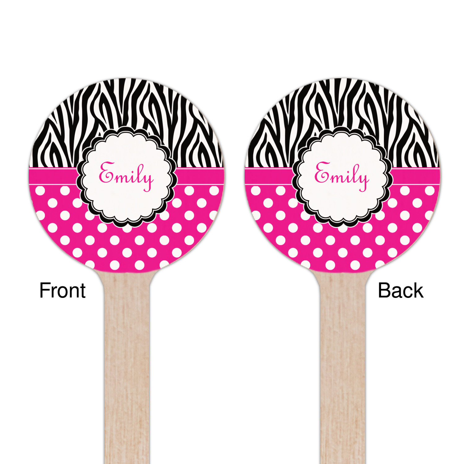 A white scalloped circle label edged in black highlights the personalization of your choice. A wide hot pink band trimmed in white completes the design.