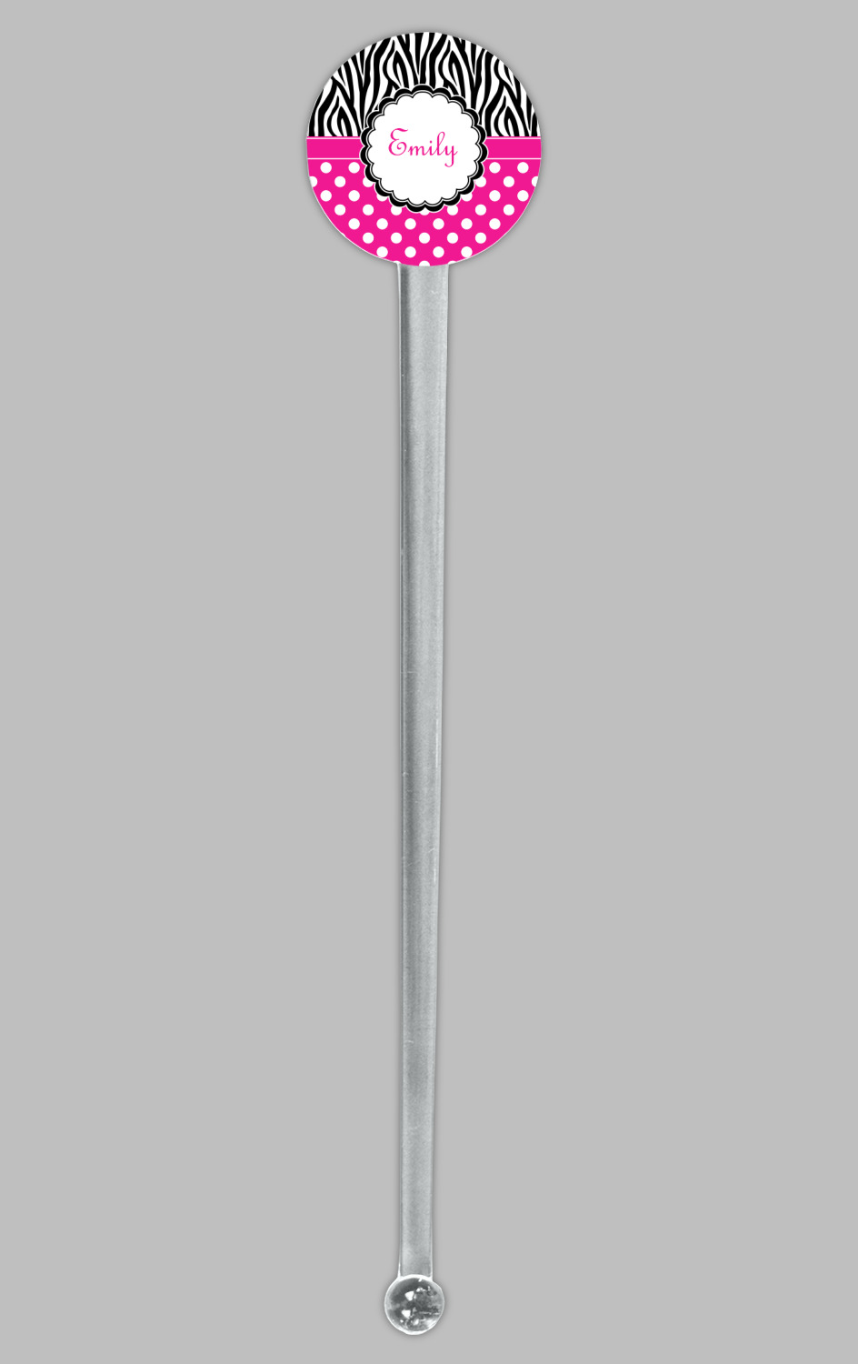 A white scalloped circle label edged in black highlights the personalization of your choice. A wide hot pink band trimmed in white completes the design.
